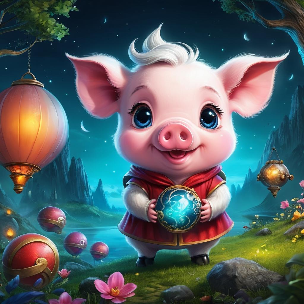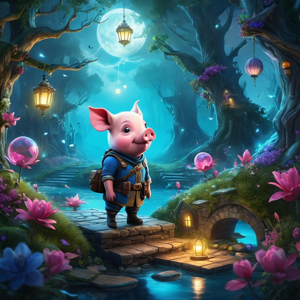 在这幅充满童真的插画中,具象的小猪角色与抽象幻想生物的互动,构建了一幅充满故事感的画面。通过分析小猪的情感表达和蓝色生物的抽象形态,我们可以将其转化为一个关于友谊与安慰的故事。黄色的魔法道具则为整个画面增添了神秘气息,象征着希望或力量。在设计插画时,通过细致的光线、色彩和纹理处理,增强作品的视觉吸引力,使观众能够沉浸于幻想与现实交织的世界中。