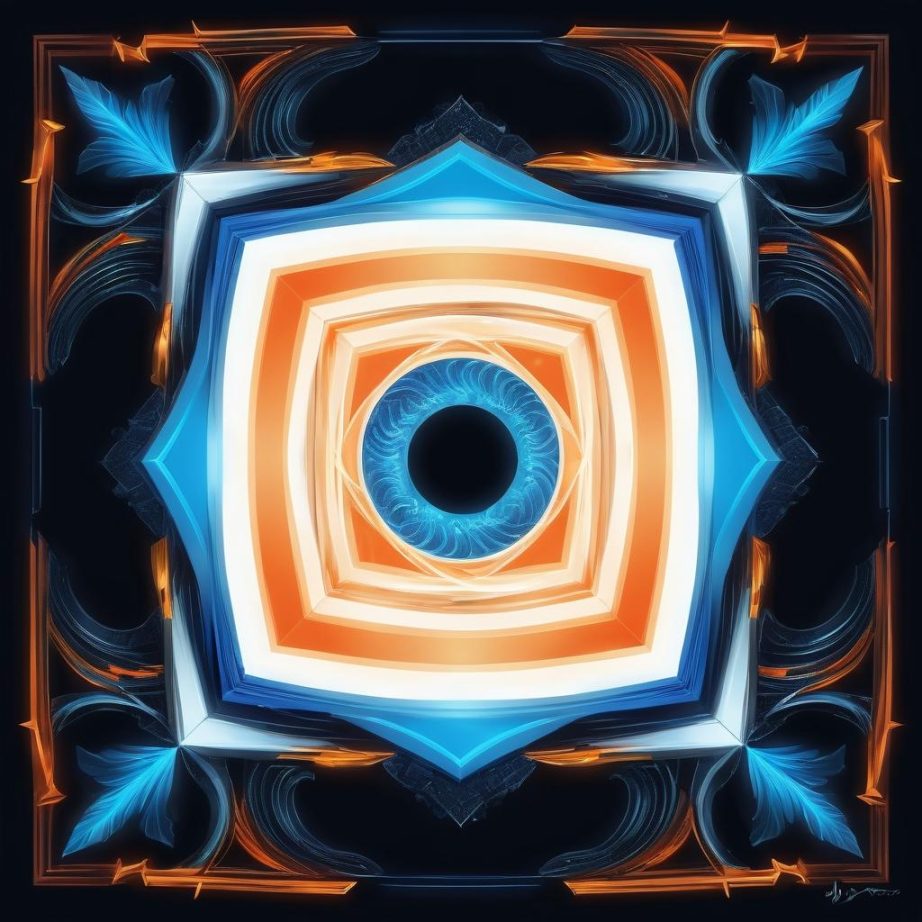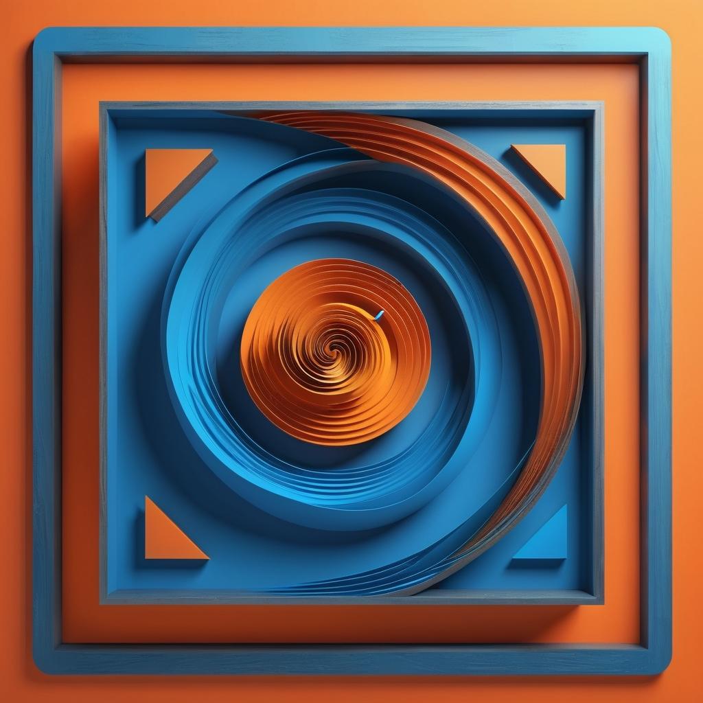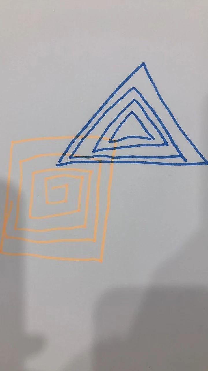 这幅图包含两个几何图案:一个橙色的正方形螺旋和一个蓝色的三角形螺旋。正方形螺旋象征着稳定和秩序,而三角形螺旋可能代表变化和动态。两者在图中相互交叠,形成一种视觉上的对比与平衡。