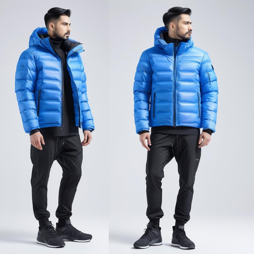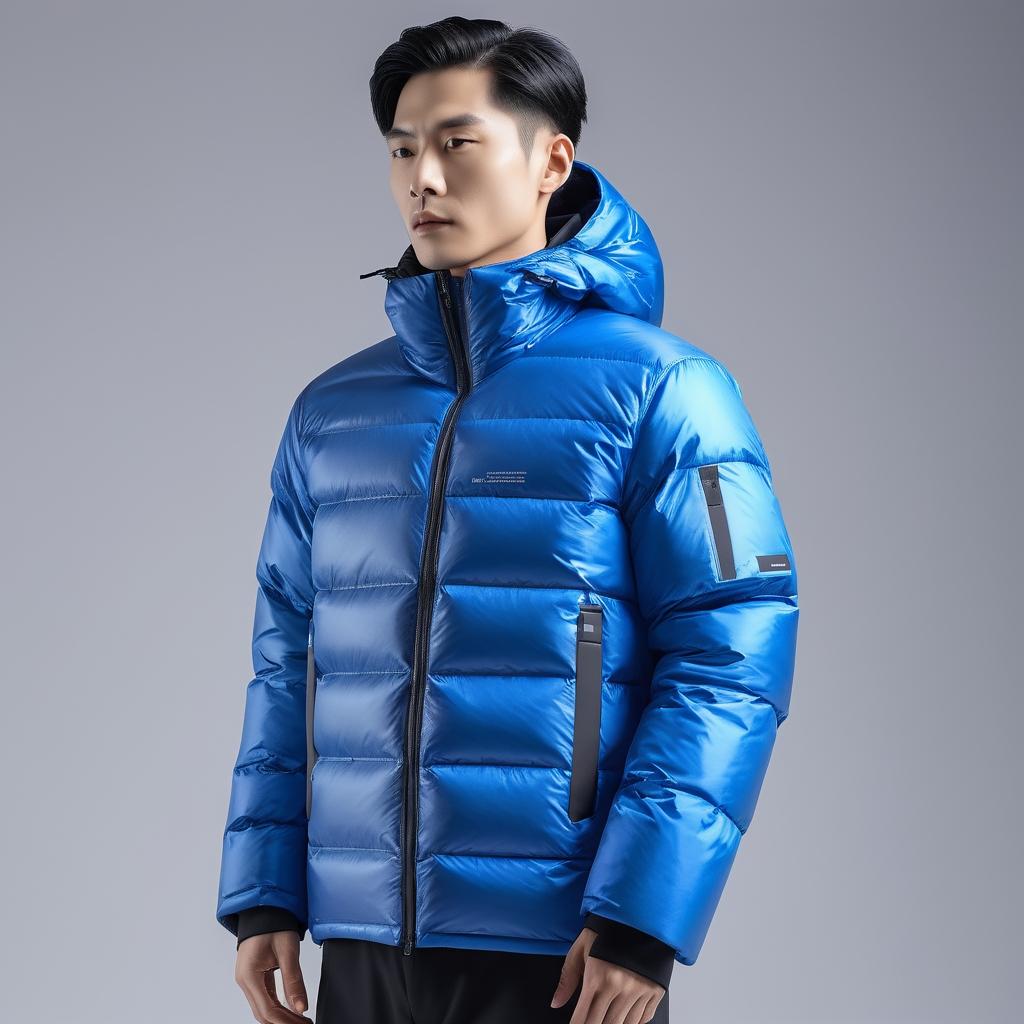 这幅图片中展现的水彩笔以其简约而富有现代感的设计启发了羽绒服设计的创作灵感。笔的直线条与冷静的蓝色调结合,传递出一种理性与秩序感,这正是当代时尚设计中简约风格追求的核心。通过将这种视觉元素转化为服装设计,羽绒服可以在功能性与美学上实现统一。现代材料的运用,如具有反光效果的面料,不仅增添了视觉上的亮点,还提升了服装的实用性。设计中对阴影效果的借鉴通过多层面料的叠加表现,使得羽绒服在简约中不失深度与质感,最终由真人模特展示,强调其在时尚与功能上的双重魅力。