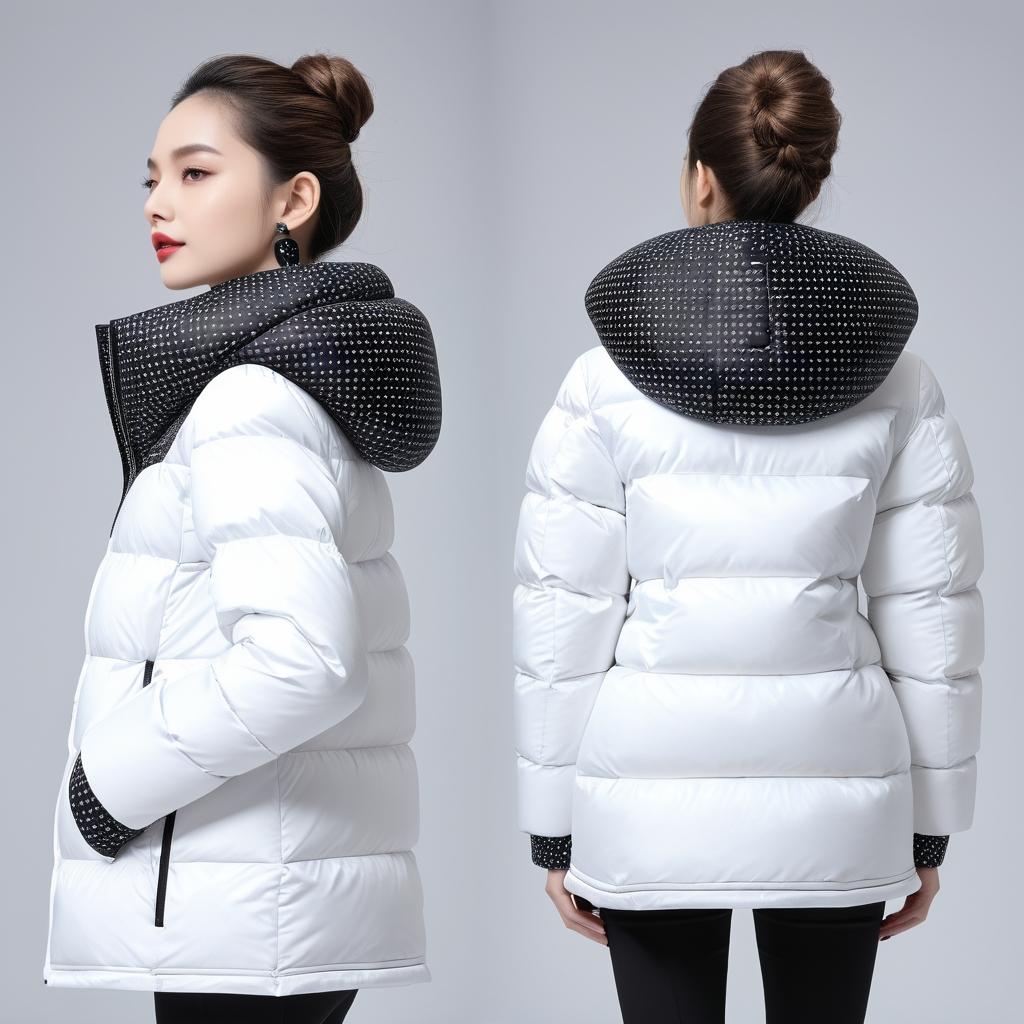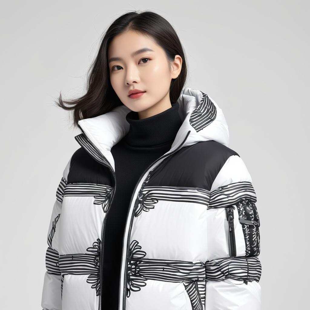 从这幅手稿中汲取灵感,可以将其简约而富有表现力的元素转化为羽绒服设计。设计可以采用对比鲜明的黑白色调,结合可爱的图形装饰在衣领或袖口等细节位置,增强视觉吸引力。使用柔软但具有结构感的面料,以确保羽绒服在冬季使用时的功能性和舒适度。同时,设计中可以融入可拆卸的发辫形状饰品,增加趣味性和独特性。这种设计由真人模特展示,将这种可爱的图形与现代羽绒服设计完美融合,强调服装的创意性和实用性。