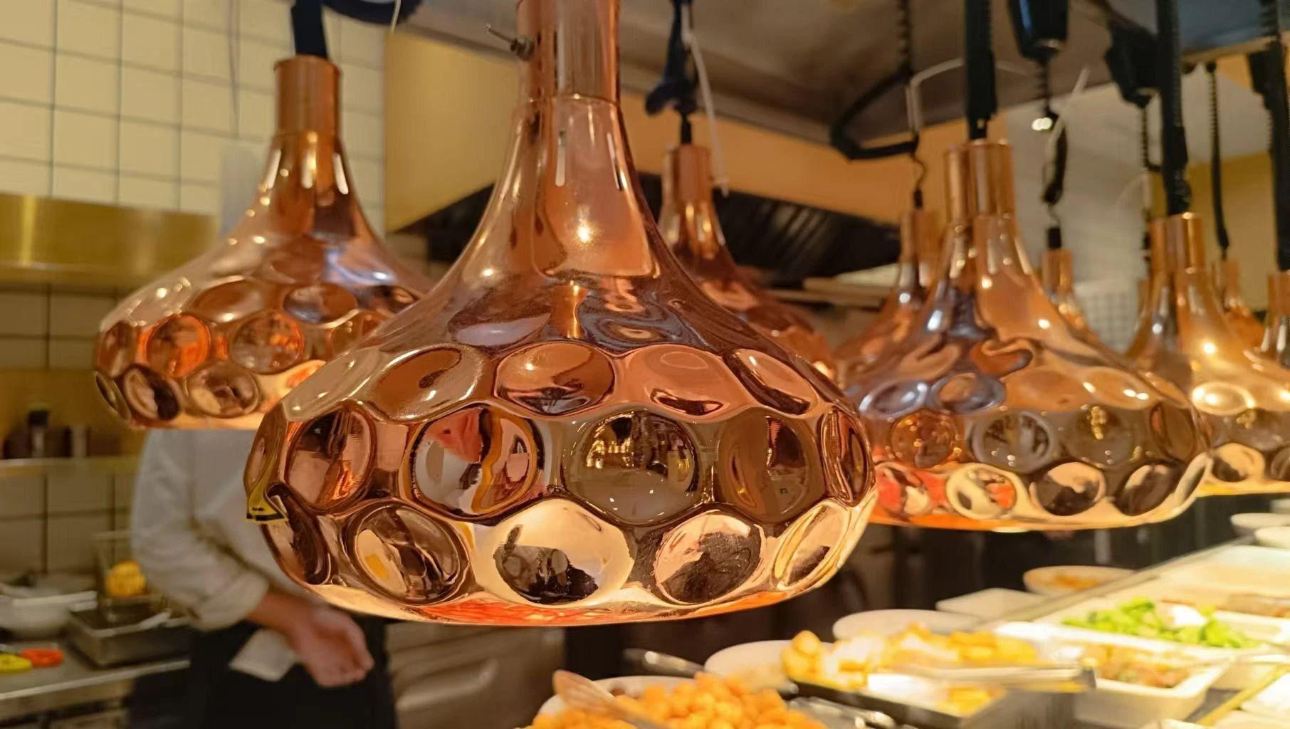该作品是一张室内拍摄的照片,聚焦于一组金属吊灯。吊灯的光泽和反射效果营造出一种温暖而奢华的氛围。光影的变化使得吊灯表面呈现出丰富的色彩层次,背景中隐约可见的厨房环境为整体营造了生活化的场景。整体构图使人感受到一种现代感与复古风的结合。