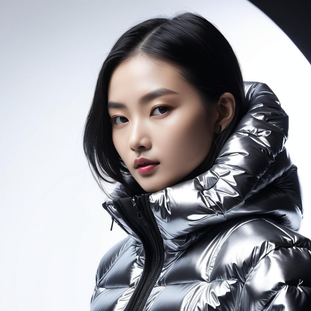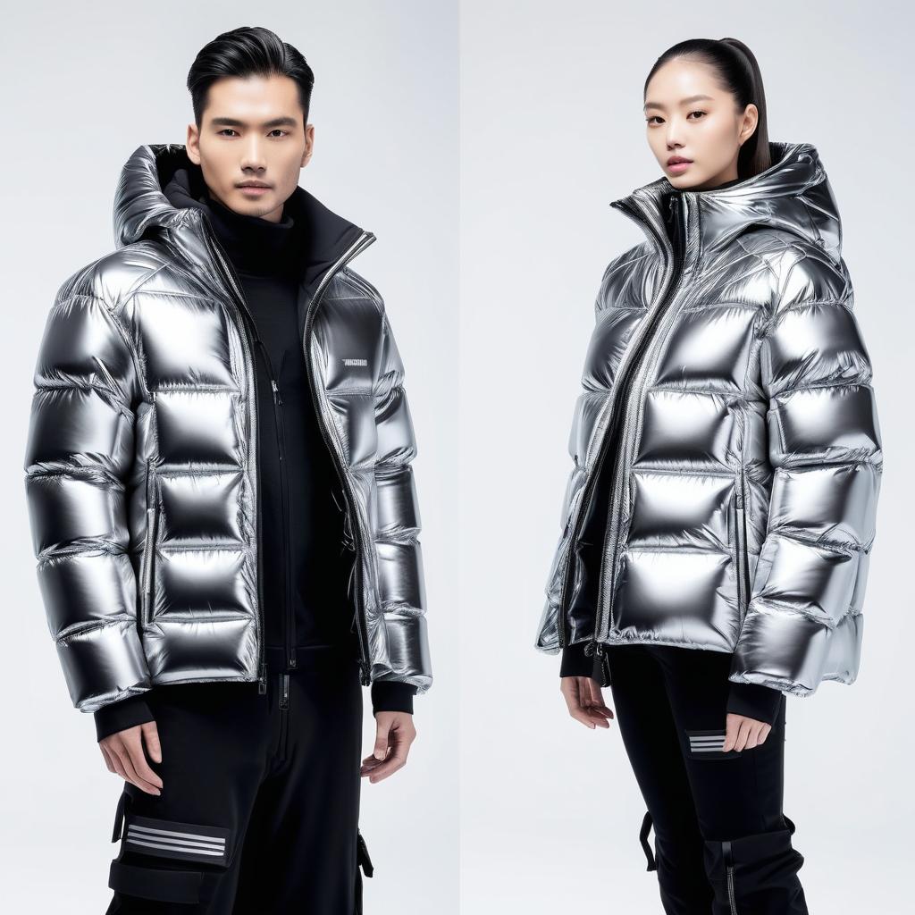 这张照片中的吊灯形态和表面的光影效果为羽绒服设计提供了丰富的灵感。可以通过模拟吊灯的流线型结构与光泽,将其转化为羽绒服的剪裁和面料设计。金属色的面料与几何形的绗缝图案结合,能够呈现出一种前卫的科技感。使用光滑的反光材料,模仿灯光反射效果,使羽绒服在不同光线下展现出丰富的色彩变幻。这样一件设计作品通过真人模特展示,可以更好地体现其独特的光影效果和结构美感。