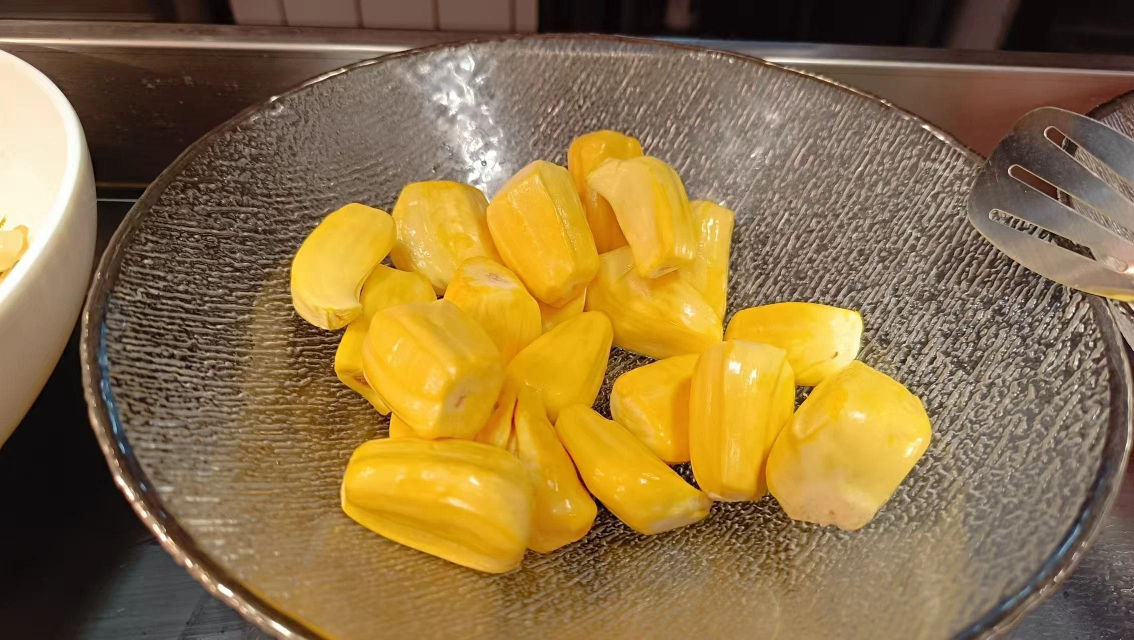 这是一张展示菠萝蜜果肉的照片,色彩鲜明,果肉的黄色与透明玻璃盘形成了视觉上的对比。光影效果突显了果肉的质感,使其看起来新鲜且诱人。整体构图简单而直接,背景元素较少,强调主体的饱满与光泽。
