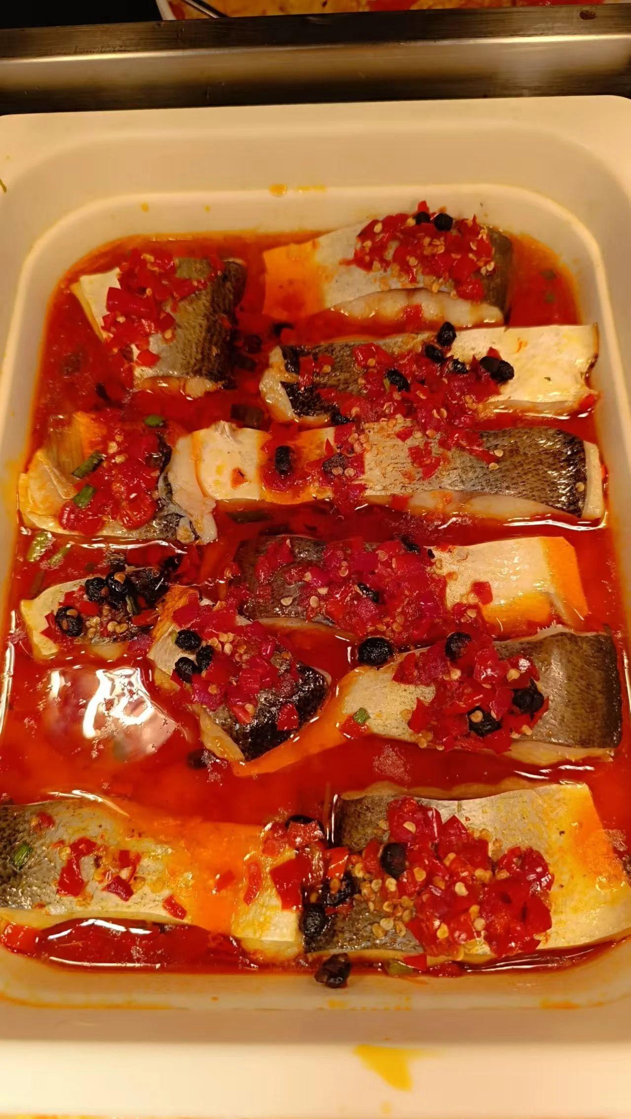 这幅照片展示了一道色彩丰富的菜肴,其中红色的辣椒与鱼肉形成了强烈的对比,增添了视觉上的刺激。颜色的运用传达出一种热情和活力,带有浓郁的地域风味。油光的表面反射出光线,增加了整体的层次感和质感。背景简洁,突出主体,给人温暖而充满活力的感觉。