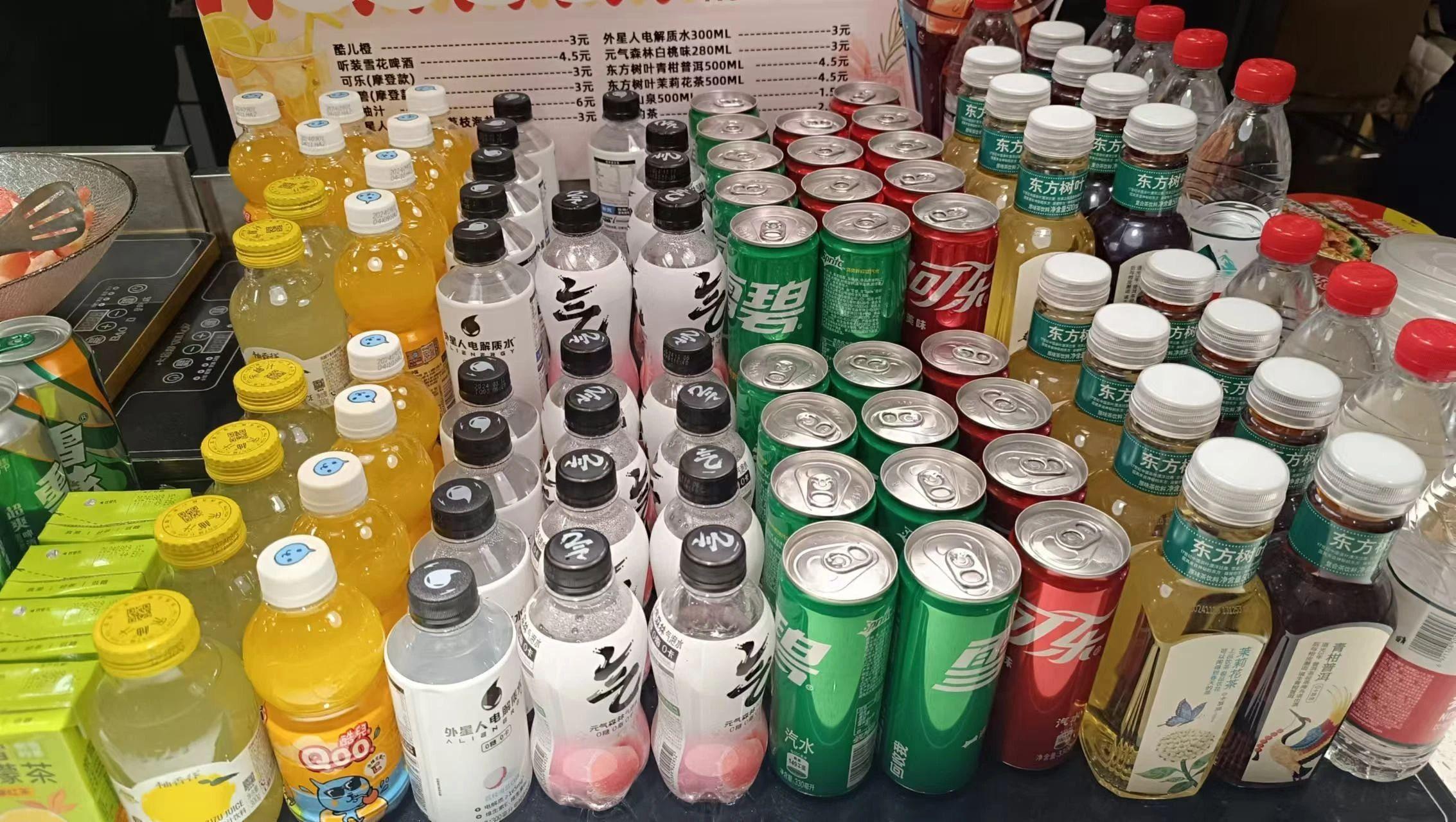 这张照片展示了一个丰富多彩的饮料陈列。瓶子和罐子的排列整齐,色彩缤纷,形成了视觉上的层次感与对比。饮料的标签设计和色彩运用传递出品牌的个性与活力。背景中的菜单板虽然模糊,但为场景增加了一层现实背景的叙事性,暗示着这是一个商店或餐厅的销售场景。整体氛围轻松且充满活力,适合在羽绒服设计中引入这些丰富的色彩组合与排列方式,借此激发设计灵感。