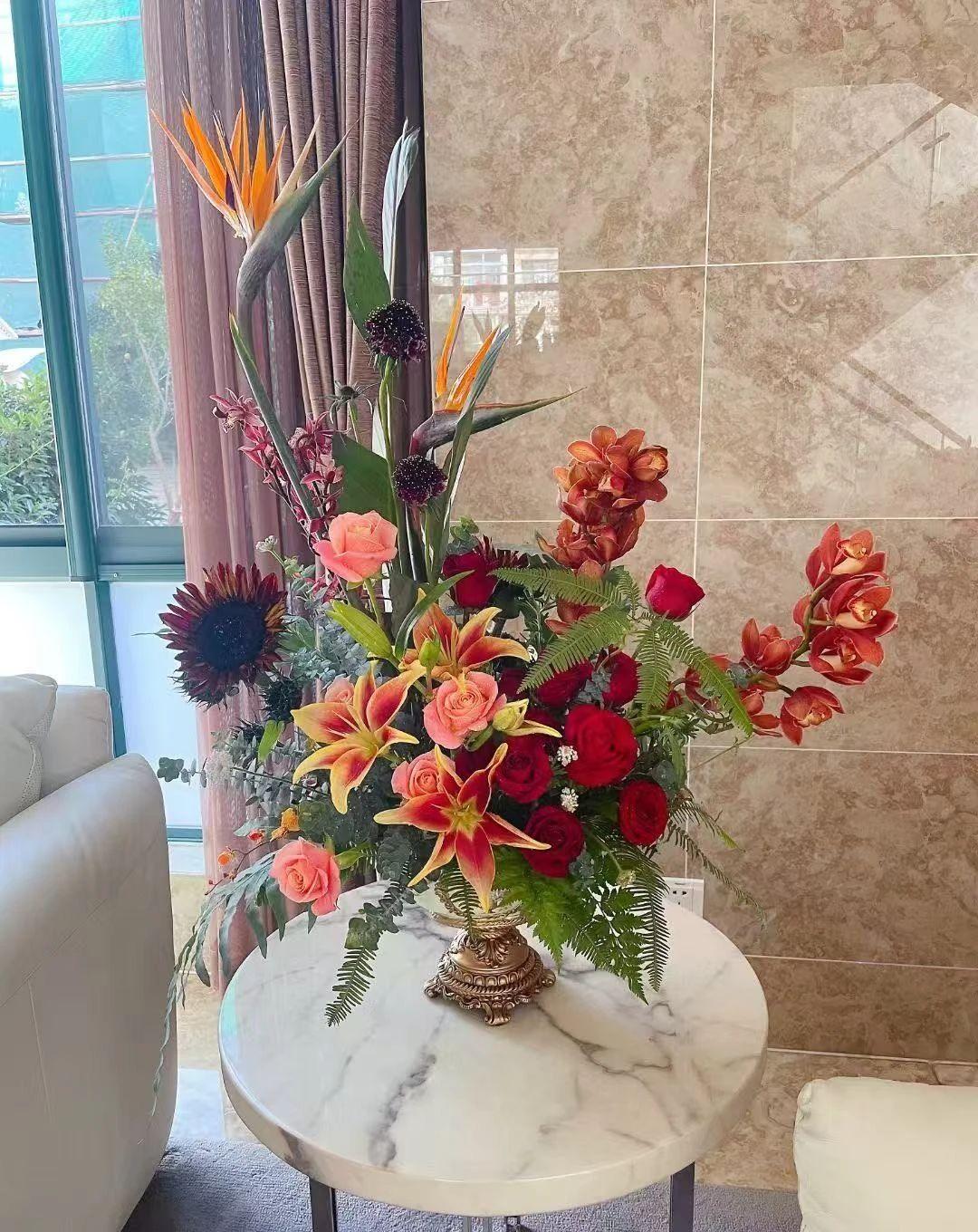 这幅照片展示了一组色彩丰富的花卉,背景是现代室内环境。花卉的色彩层次丰富,从鲜艳的橙色鸟的天堂花到深红色的玫瑰,搭配绿色的蕨类植物,形成鲜明的对比。光影效果柔和,窗户的自然光线增添了照片的温暖感。整体构图平衡,花卉在画面中居于中心位置,营造出一种典雅且充满生命力的氛围。