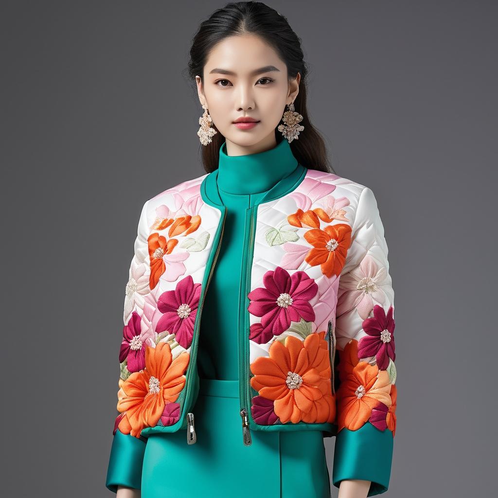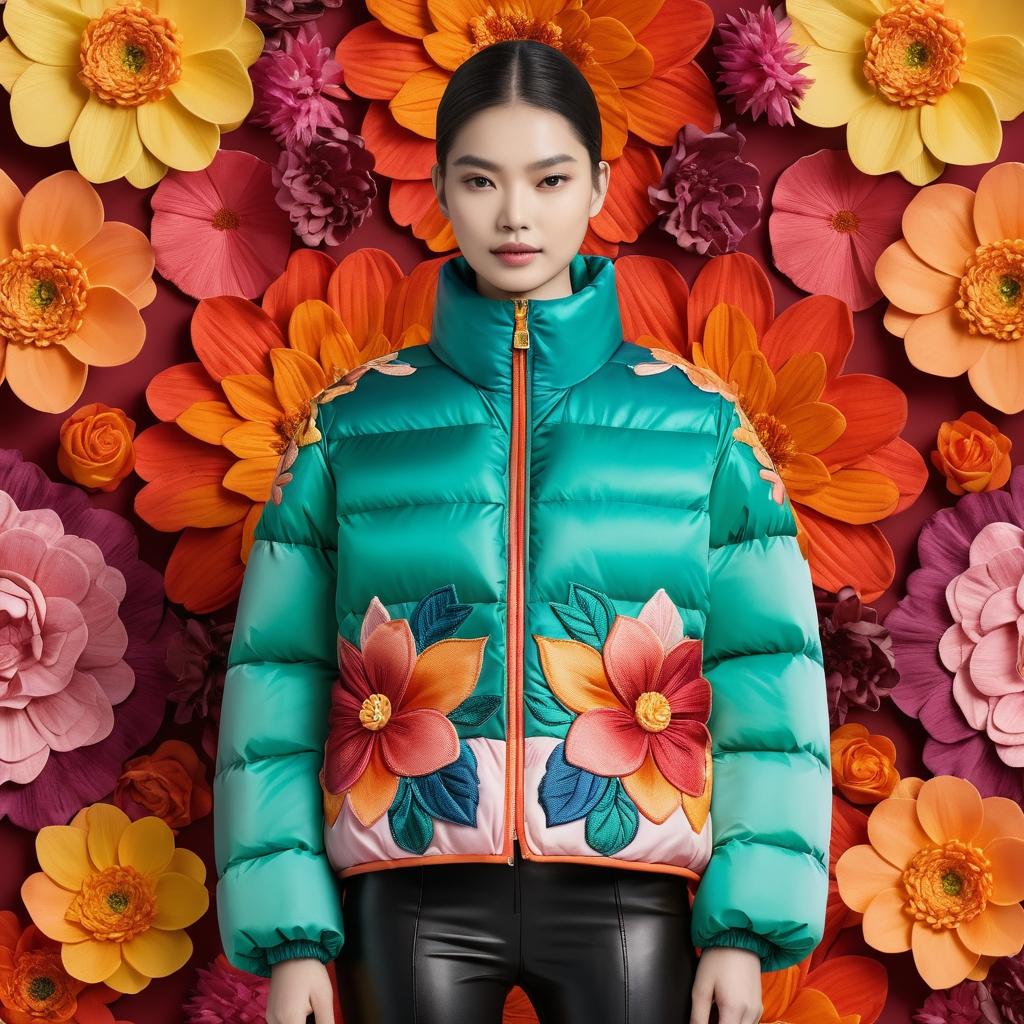 这幅色彩丰富的花卉作品为羽绒服设计提供了独特的灵感来源。照片中各种色彩的花卉组合——从橙色的鸟的天堂花到深红色的玫瑰——不仅呈现出鲜明的视觉对比,也传达出丰富的情感。通过将这些色彩和形态引入羽绒服设计中,我们能够创造出一种既具文化融合感又充满自然灵动性的作品。设计师可以利用渐变色调和花卉图案来增添服装的艺术性,而柔和的面料则能够再现花瓣的细腻质感。通过结合这些元素,羽绒服不仅在视觉上引人注目,还能在功能性和舒适性上达到完美平衡,使时尚爱好者能够在寒冷的季节中感受到来自大自然的温暖与美丽。