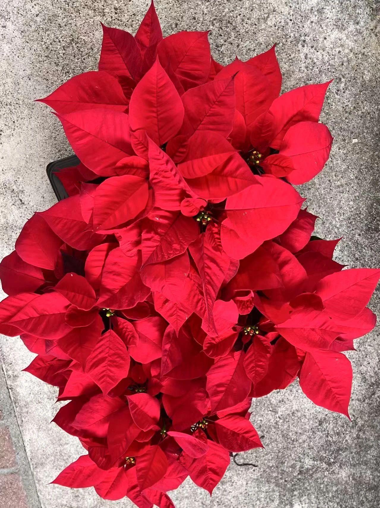 图片中展示了一簇鲜艳的红色圣诞花(Poinsettia),这是一种常见的圣诞节装饰植物,具有强烈的节日色彩。图中缺乏明显的人物元素,但其鲜明的红色调本身就是节日氛围的重要组成部分。背景为简单的灰色混凝土地面,提供了良好的对比度,使红色更加突出。光影效果自然,整体构图集中于植物的形态与色彩。