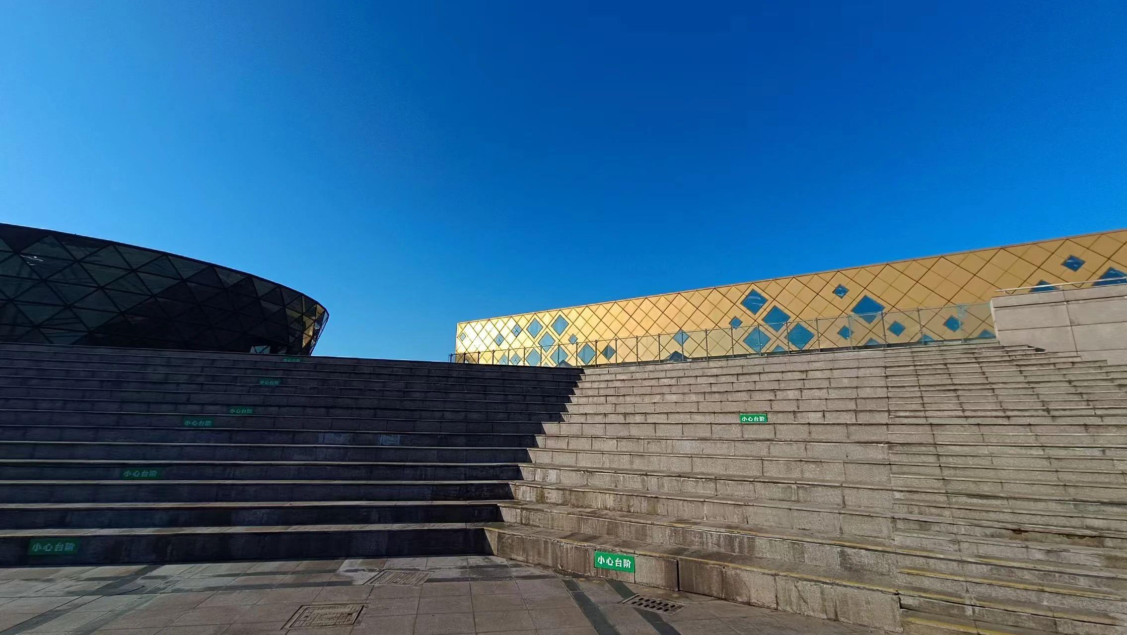 這幅圖片主要由幾何形狀的建築和階梯組成,色調明亮,天空呈現清澈的藍色。金色和黑色的建築形成鮮明對比,營造出現代且未來感的氛圍。圖中沒有明顯的人物,使建築的線條和形狀成為視覺焦點。