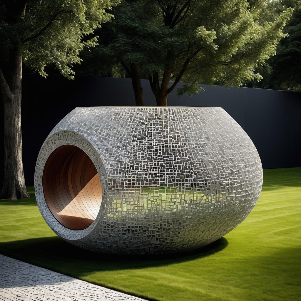 将这幅手稿的建筑和自然元素转化为雕塑设计,可采用层叠式的几何形状,表现出建筑的阶梯式结构。材料上可以选用石材或金属,以增强雕塑的稳重感。树木的元素可以通过流动的线条或曲线形态来体现,使用木材或玻璃材质,以引入自然的温暖与透光效果。整体设计应注重形态的对比与和谐,增强雕塑的空间表现力和视觉吸引力。