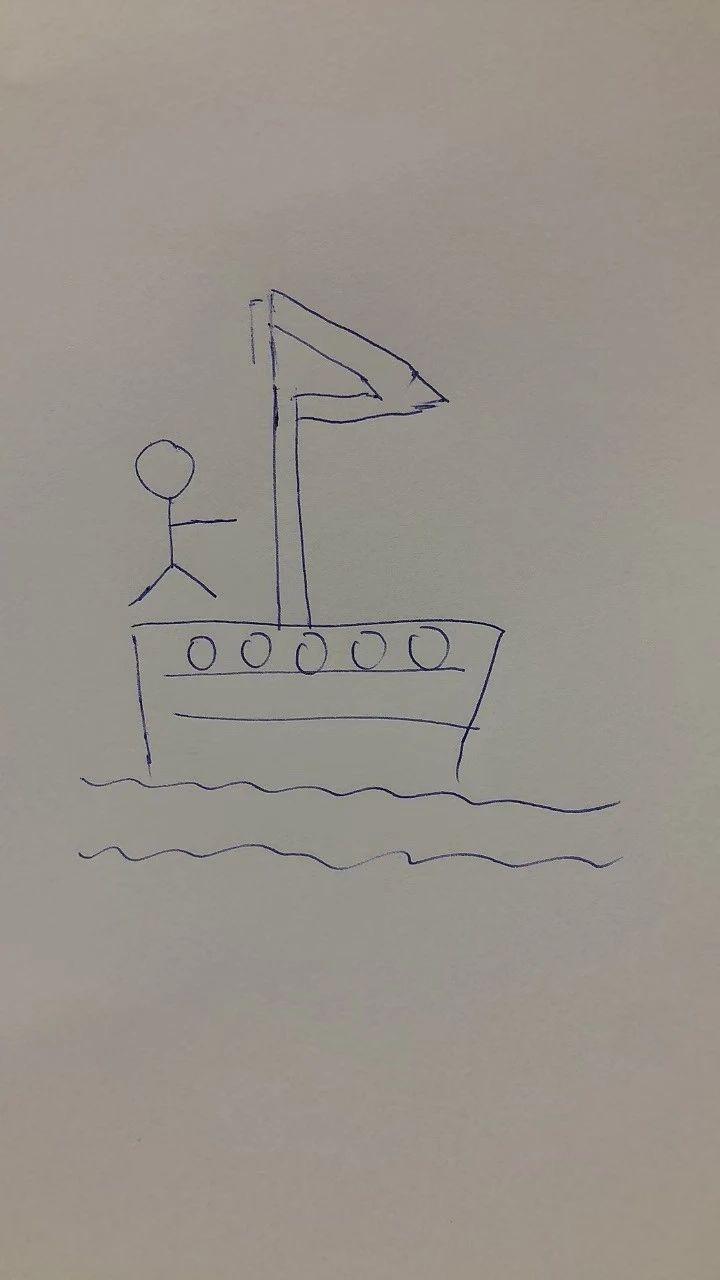 这幅手稿描绘了一艘船,船上有一个简单的火柴人,有着简洁的线条和几何形状。线条流畅但简单,呈现出一种孩童般的稚拙和纯真。船体的弧线和旗帜的形状为构图增添了动态感,而水波状的线条则暗示着运动和流动的环境。整体情感表达轻松,具有一种探索和冒险的氛围。