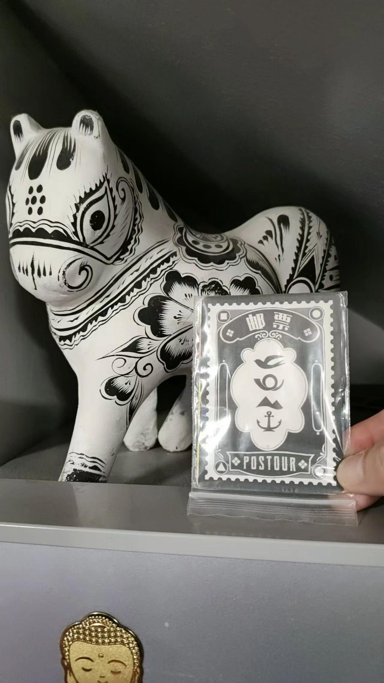 这件作品展示了一匹马形雕塑,表面覆盖着复杂的黑白图案,营造出一种细腻的装饰风格。线条流畅,图案细节富有动感,表现出一种传统与现代的结合。整体构图平衡,黑白对比强烈,赋予作品独特的视觉冲击力。旁边展示的卡片也以类似风格呈现,进一步增强了整体的艺术一致性。
