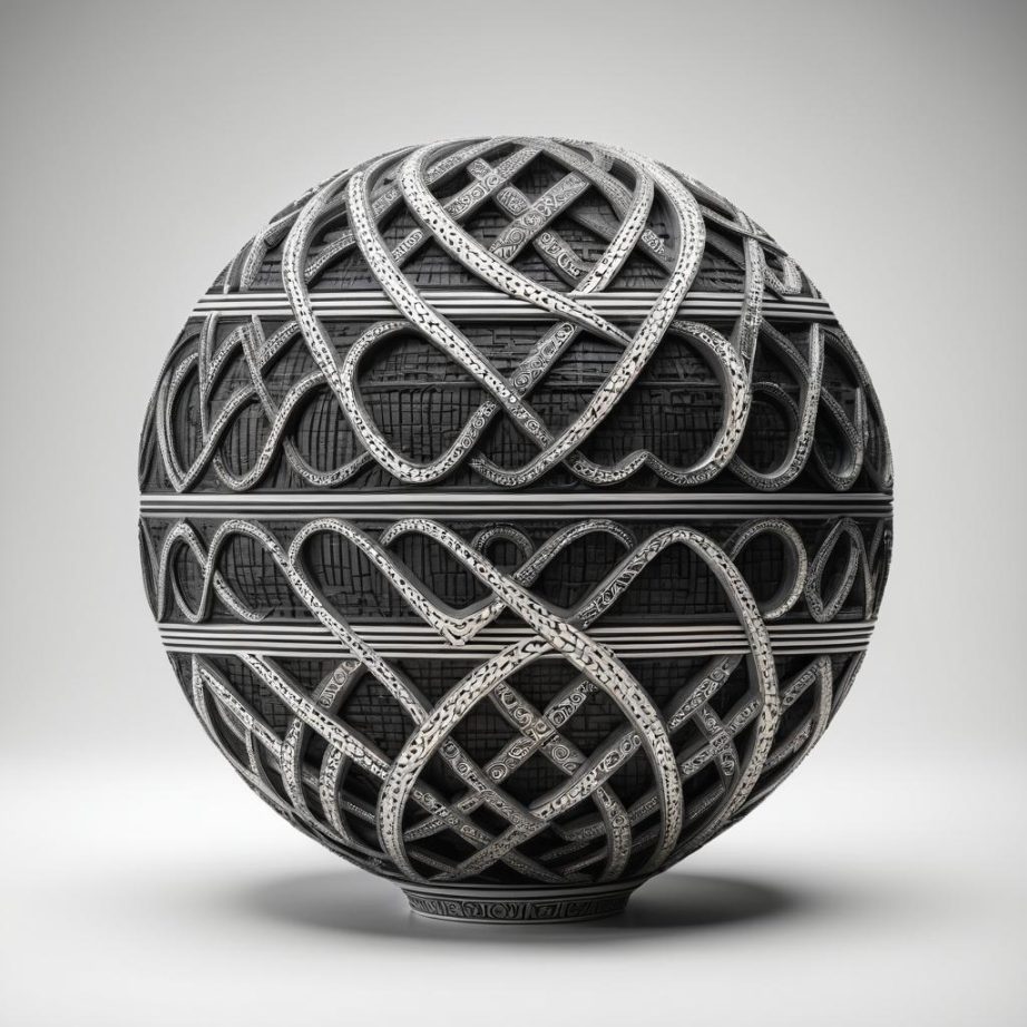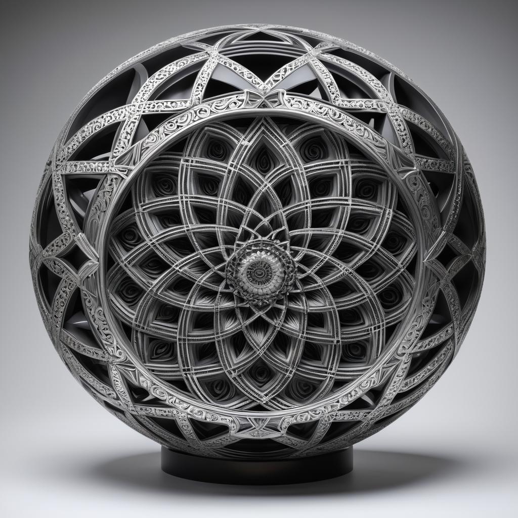 这件雕塑可以通过将表面的复杂图案融入雕塑的整体结构中,成为一件具有装饰艺术风格的作品。可以考虑使用陶瓷或金属材料,将黑白对比的图案雕刻在表面,形成一种浮雕效果,增加作品的触感与视觉深度。通过调整雕塑的光影效果,增强其空间表现力,使其在不同视角下展现出不同的艺术魅力。