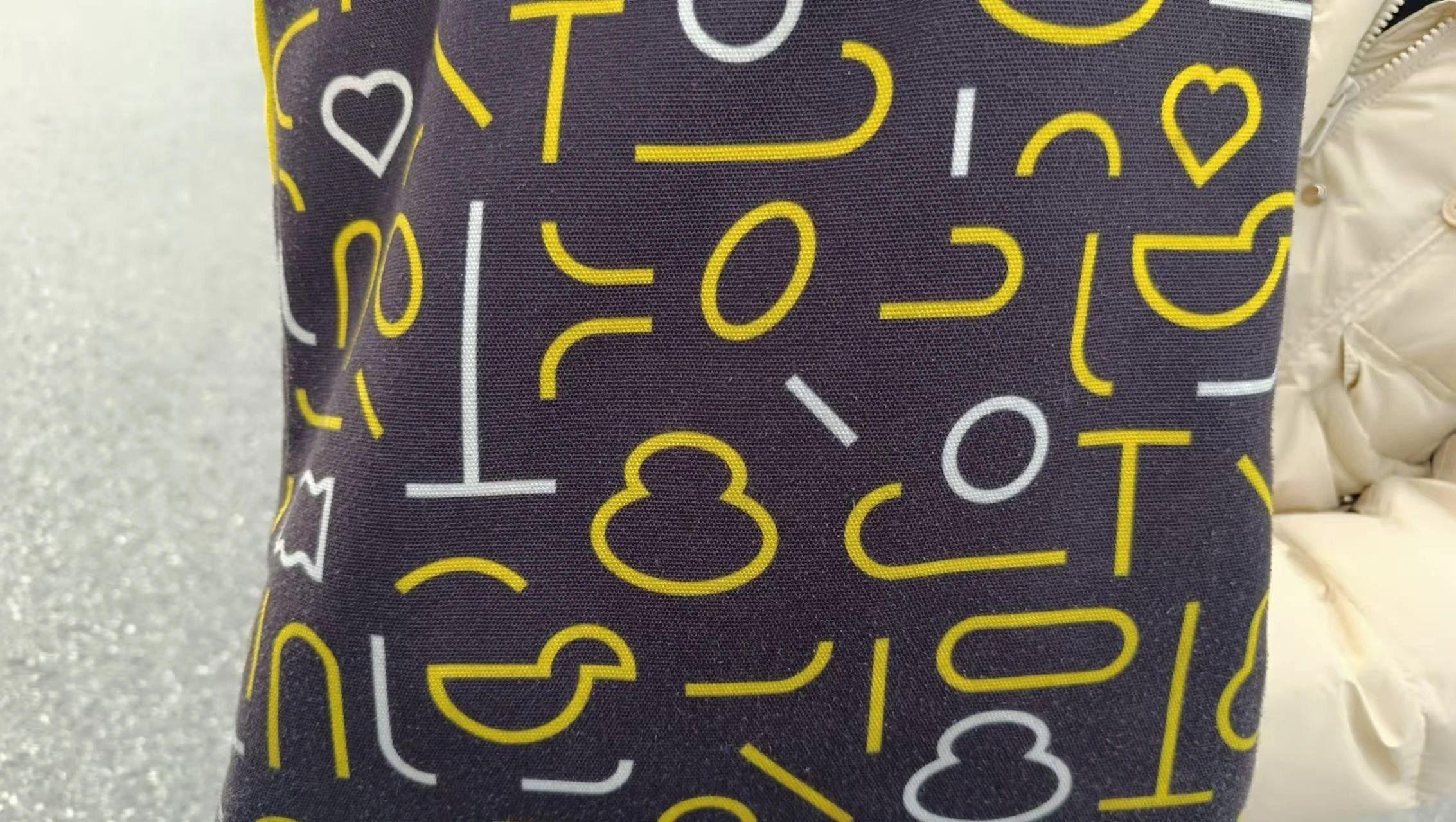这幅图像展示了一个具有现代感的图案设计。图案由黄色和白色的线条构成,形成了各种抽象的符号和形状。背景为深色,突出显示线条的色彩对比。此设计传达出一种时尚和活泼的氛围,适合用于时尚配件或室内装饰。整体构图平衡且具有动态感,色彩使用简洁而富有表现力。
