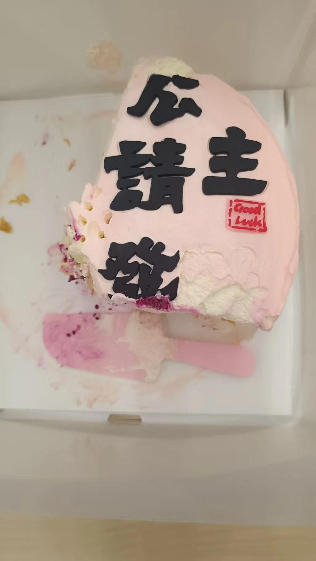 这幅图片展示了一个被切开的蛋糕,上面有中文字样和一个 ‘Good Luck’ 的印章。蛋糕的色彩以粉色为主,营造出一种温馨和庆祝的氛围。文字和印章的使用增加了视觉趣味性,具有传统与现代相结合的特点。整体构图简单,背景干净,突出蛋糕的主体地位。
