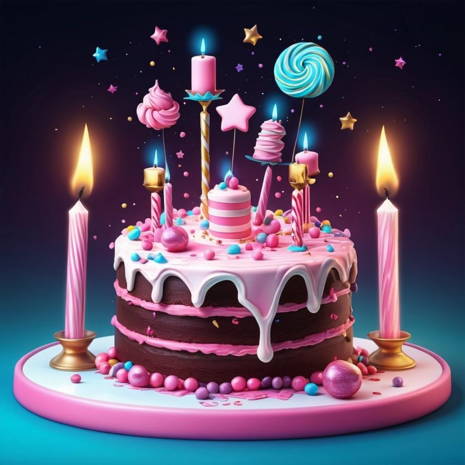 将蛋糕拟人化为一个庆祝场景中的角色,它可以是某种庆祝活动的核心元素。添加幻想元素,例如飘浮的蜡烛或会发光的糖果,来增强节日气氛。