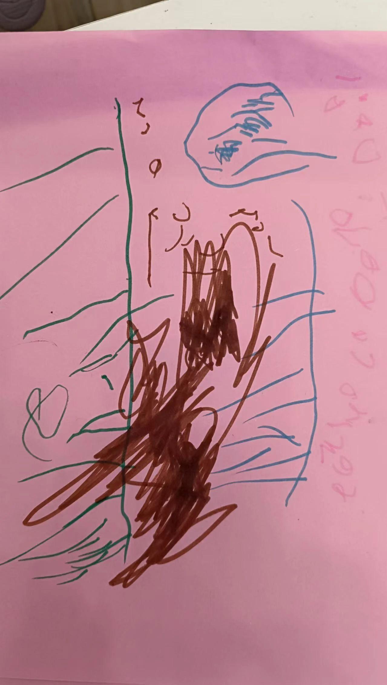 这幅图画展示了一些抽象的线条和形状,色彩主要为棕色、绿色和蓝色。画面中似乎有一个类似于头部的蓝色形状,可能象征某种虚构生物,而棕色的线条则可能代表某种动态的动作或场景。绿色线条似乎形成了某种自然元素,如植物或地形。整体呈现出一种活泼和幻想的氛围。