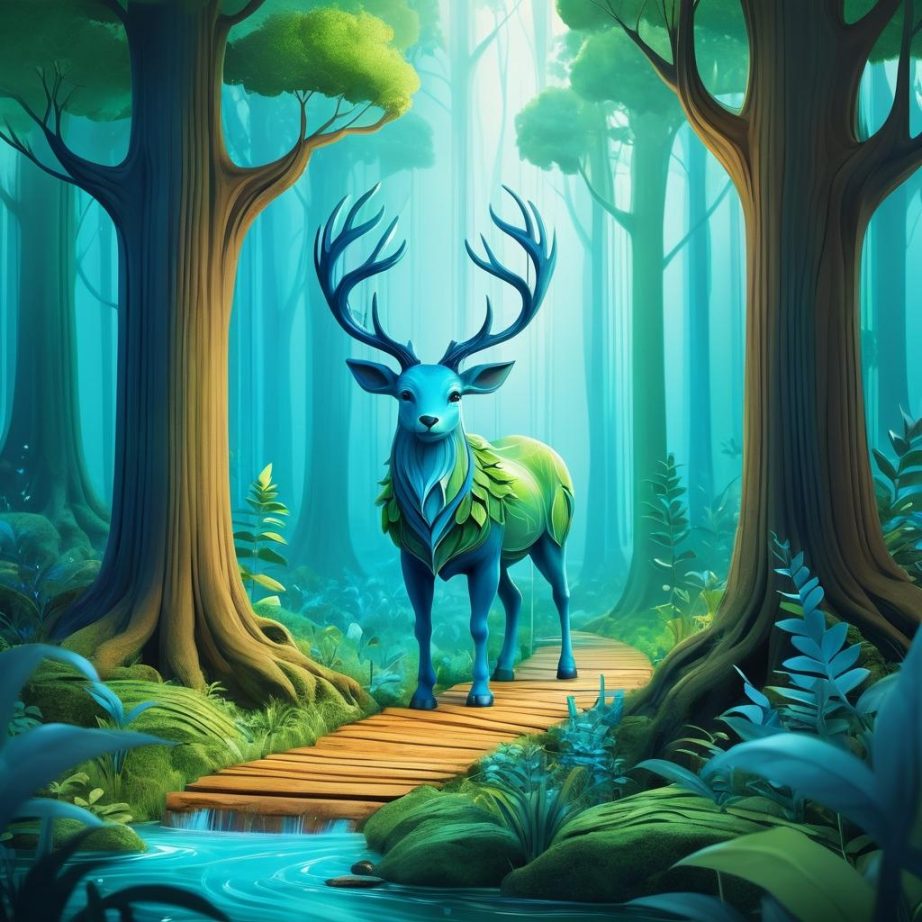 将蓝色形状发展为一种幻想生物,例如一个友善的虚构生物,利用绿色线条作为其栖息的魔法森林背景。棕色线条可以是幻想生物的动态动作轨迹,或是某种魔法的能量流动。