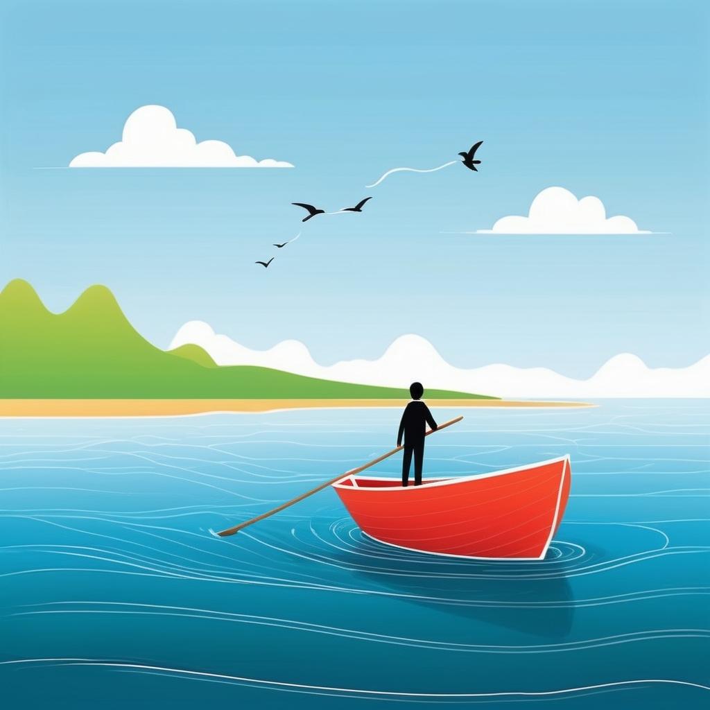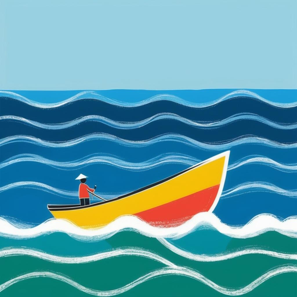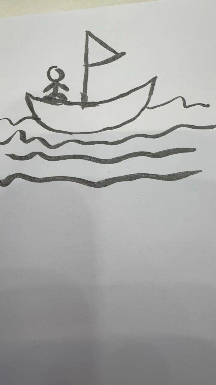 这幅画作中使用了简单的线条勾勒出一只小船和一个站在船上的小人。波浪线条暗示了海洋或湖泊的存在。整体风格非常简约,具有童趣和天真无邪的特质。此作品可能意图表达一种探索或冒险的主题,充满了轻松和自由的情感。