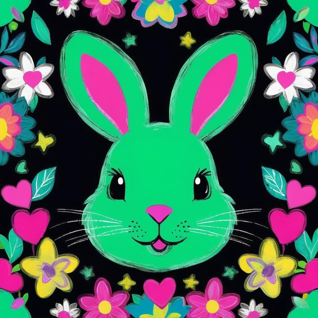 这幅作品使用了简单而鲜明的色彩,包括亮绿色和粉红色。主要元素是一个大兔子头形象,周围环绕着心形、星星和花朵图案,构图简单而富有童趣。整体风格偏向儿童涂鸦,可能传达了一种纯真和快乐的情感。