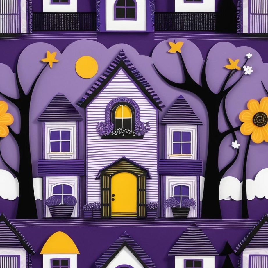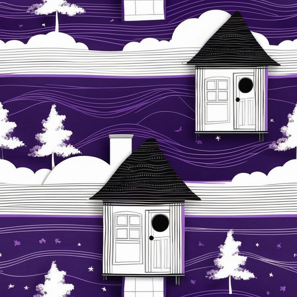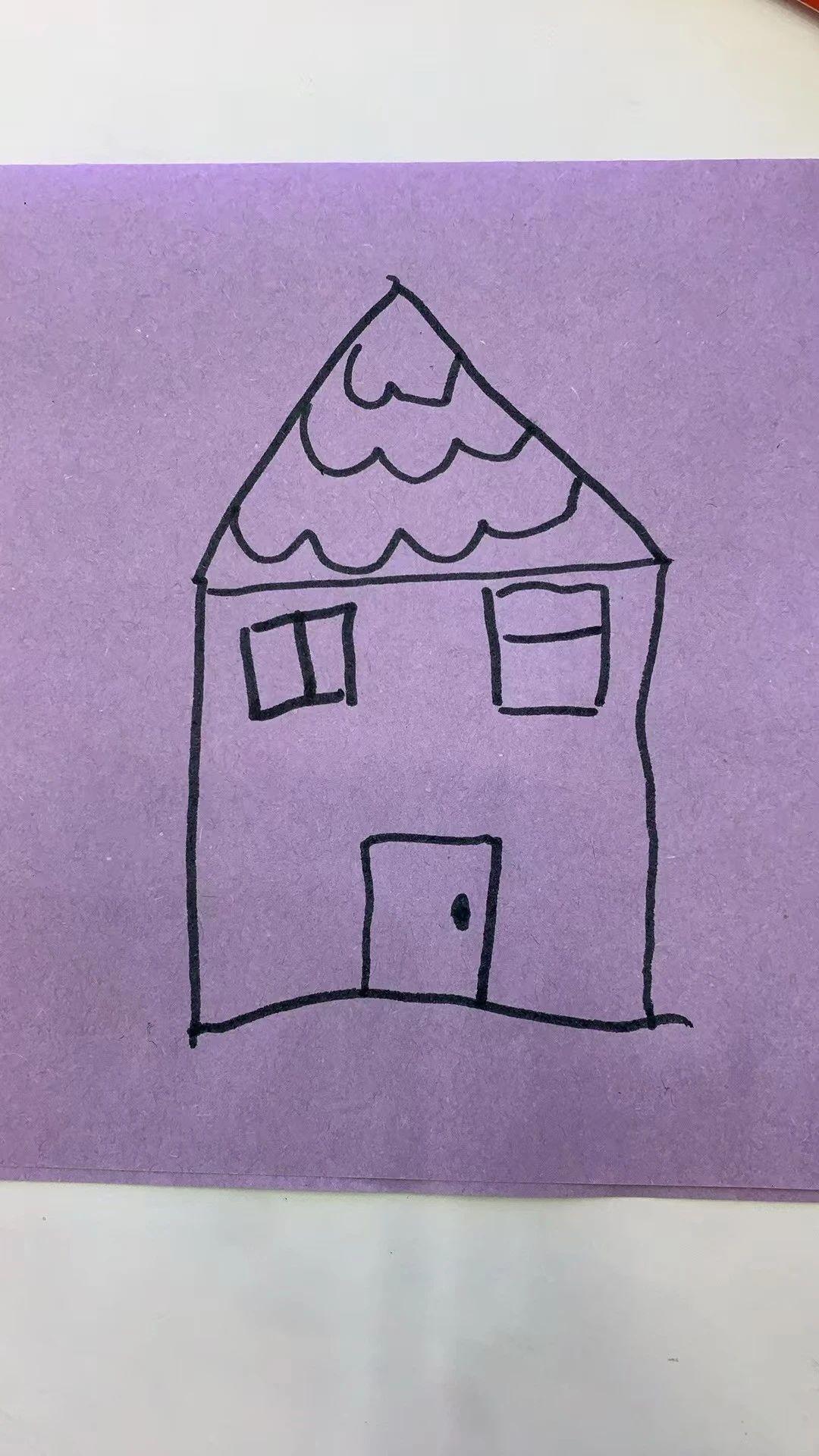 这幅简单而富有童趣的房屋画作,展示了儿童艺术的核心特质:纯真、直接和富有创造力。画作采用紫色纸张作为背景,黑色粗线条勾勒出房屋的基本轮廓,波浪形屋顶和不规则的窗户为作品增添了动感和趣味。这样的艺术风格常常出现在儿童的作品中,因为它不受规则束缚,充满了想象空间。
