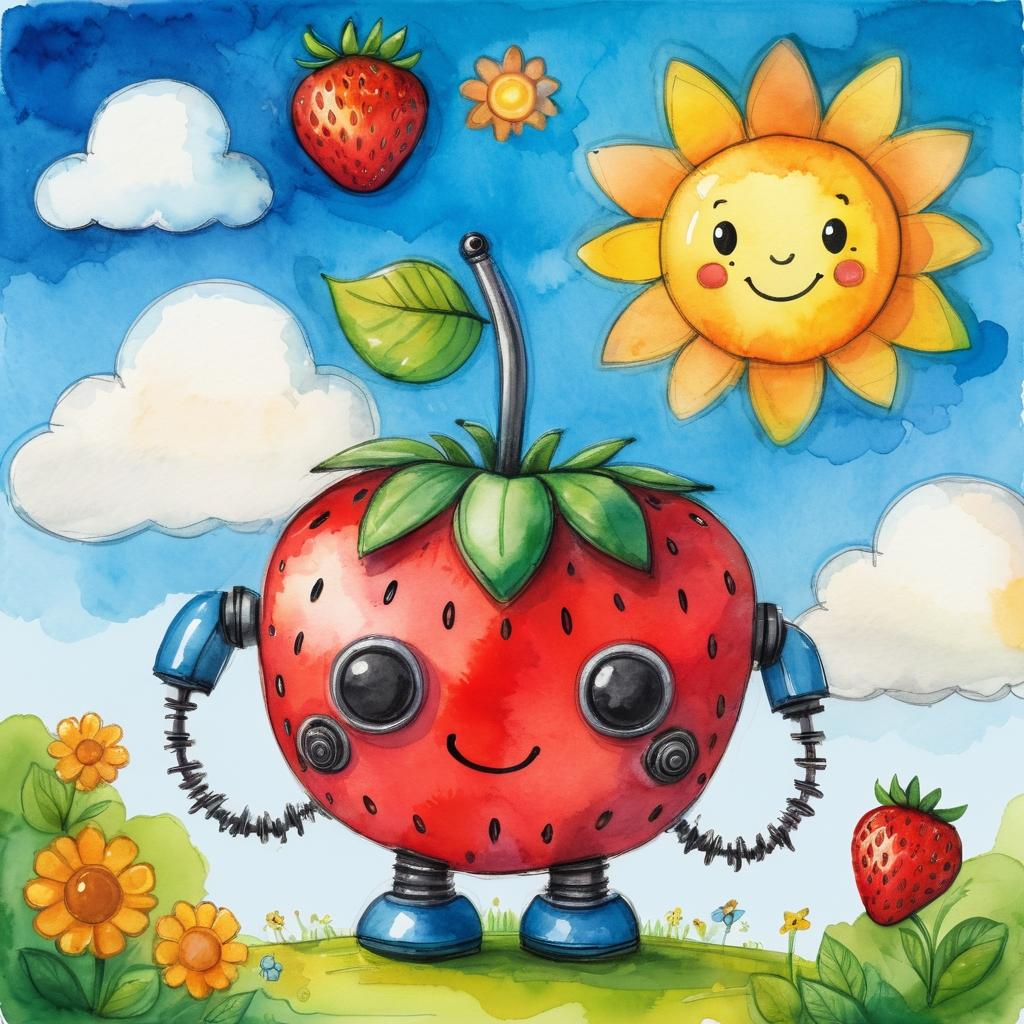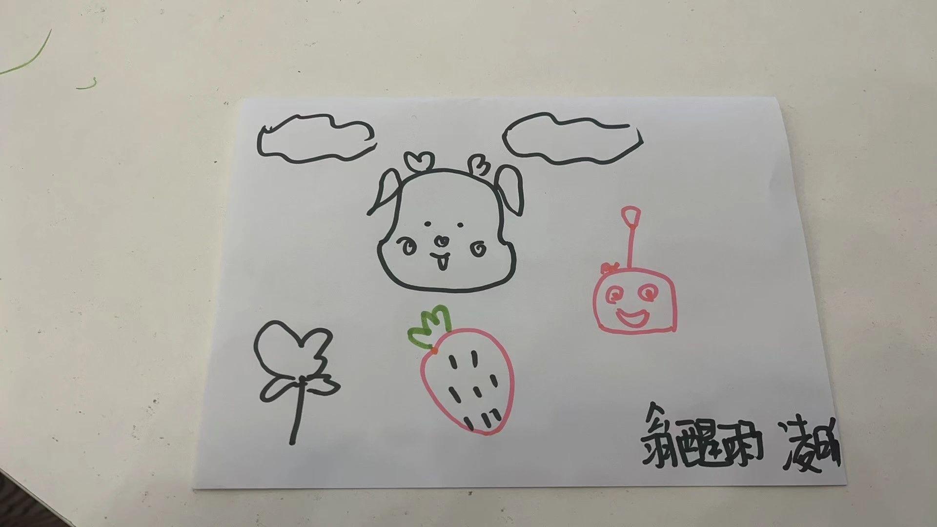 这幅画展示了简单而富有童趣的图案,包括一个可爱的动物头像、草莓、云朵、一朵小花和一个微笑的机器人。整体构图松散,线条简洁,色彩使用有限,但富有活力。创作者可能在表达一种轻松、愉快和无忧无虑的情感。
