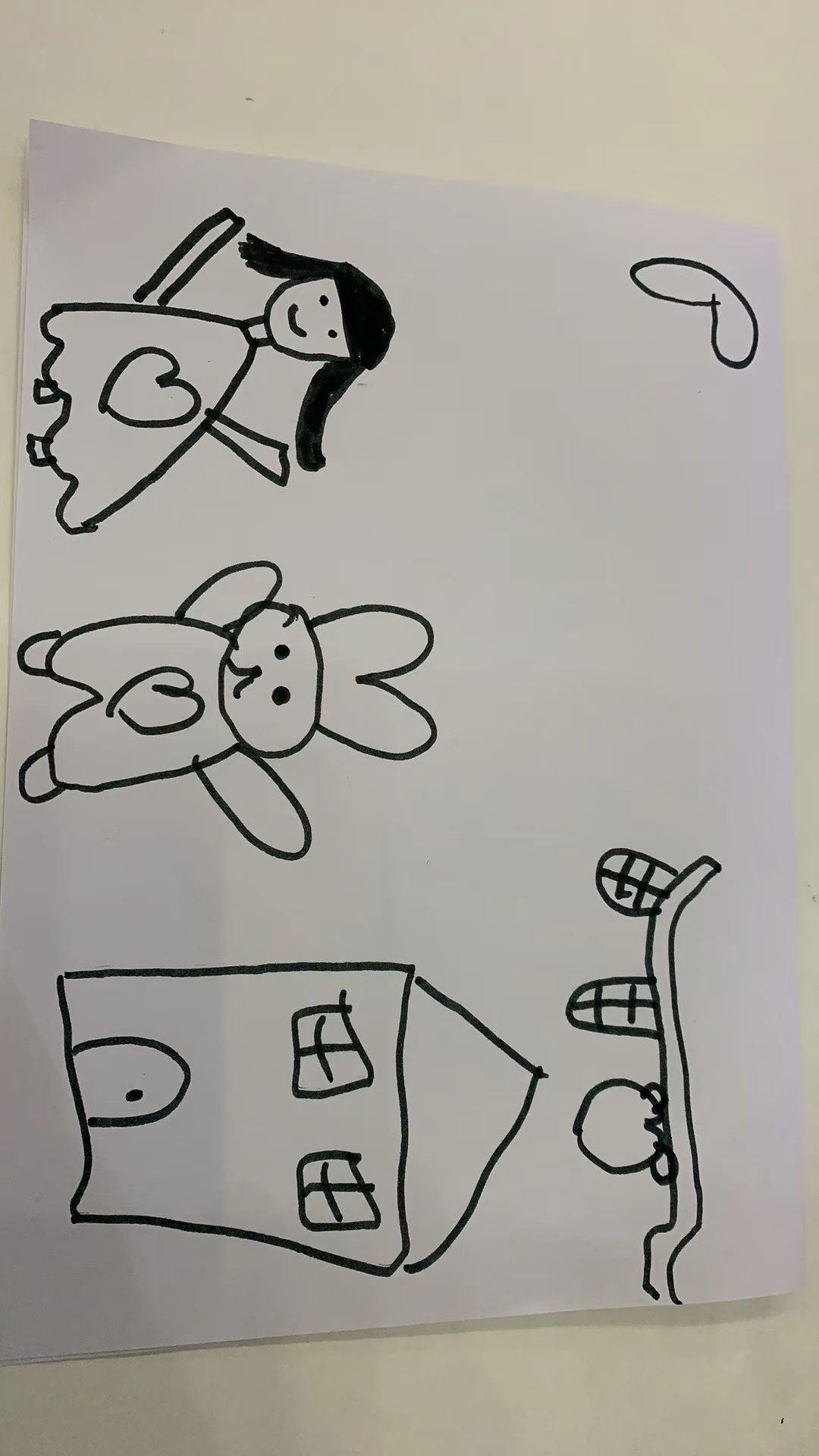 这幅画由简单的黑色线条组成,描绘了一个女孩、兔子、一座房子和一个爱心。整体风格简洁、天真,具有儿童画的特征。女孩和兔子都带有微笑,传达出一种快乐和无忧无虑的情感。房子和爱心可能象征着家庭与爱。