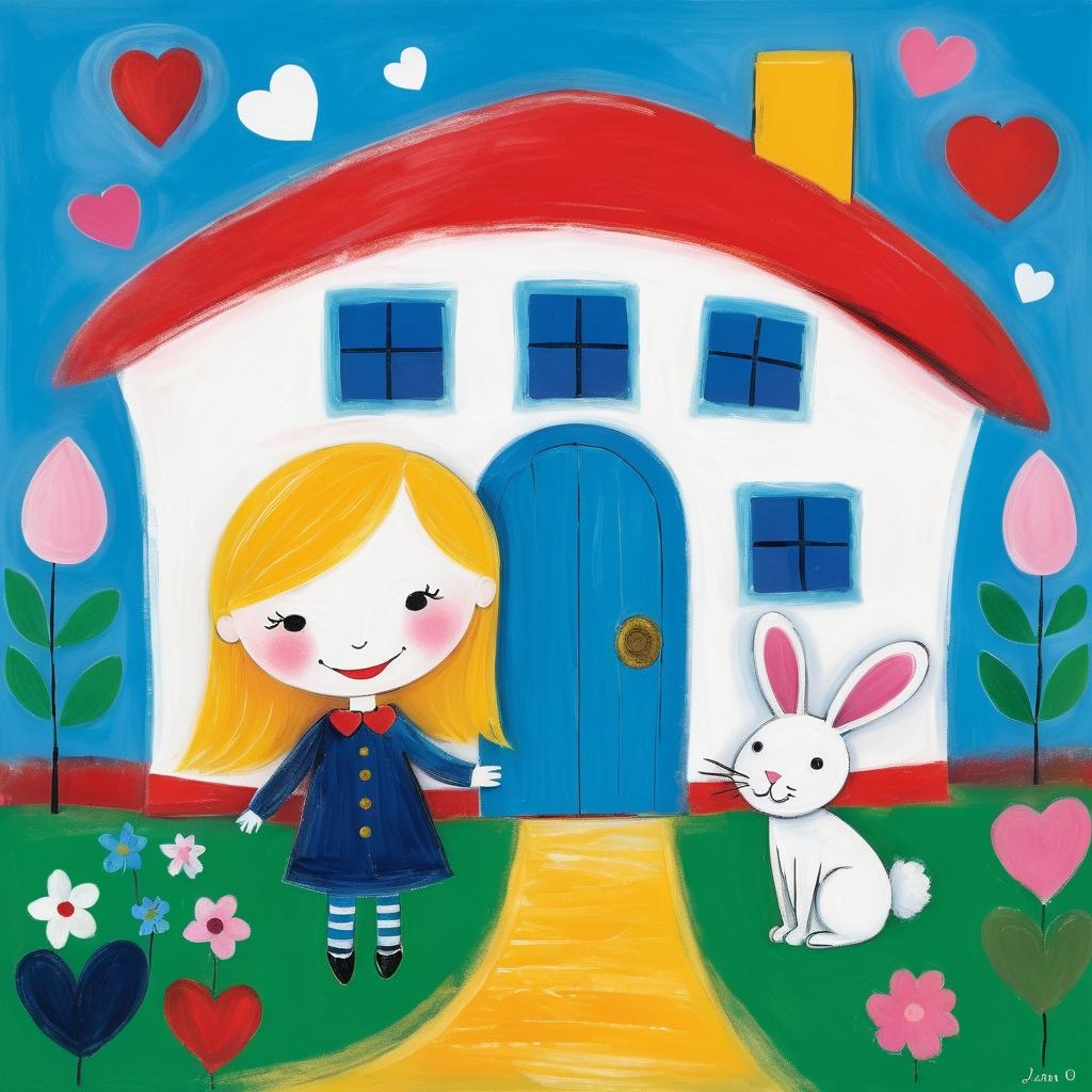 这幅充满童趣的画作展示了一位女孩和一只兔子,他们手持爱心,面带微笑,旁边是一座简单的房屋。画面的构图简单而富有表现力,以黑色线条勾勒出人物和物体的轮廓,传达出一种无忧无虑的快乐氛围。这种风格在儿童画中尤为常见,体现了孩子们对世界的简单和纯真理解。画中的房子和爱心可能象征着家庭的温暖和爱。为了进一步提升这幅作品的艺术性,可以尝试加入更多的色彩和细节。例如,背景的颜色可以选择柔和的粉色或蓝色,增加画面的层次感和视觉吸引力。此外,增加一些房屋细节,如窗户的花纹或小花园,可以使整幅作品更加生动。在艺术史上,类似的风格常见于Joan Miró的作品中,他以色彩丰富和充满幻想的画作著称。通过这样的调整和灵感借鉴,这幅作品将不仅仅是儿童的涂鸦,更能成为一件具有艺术价值的作品。