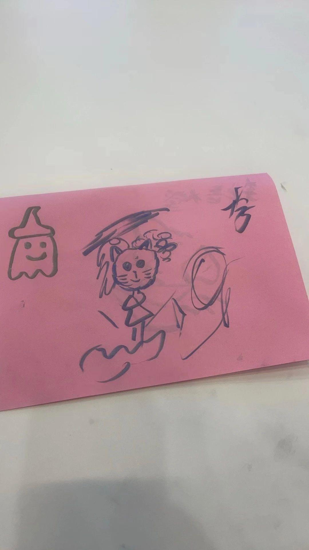 这幅作品使用了简单的线条和鲜明的色彩,呈现了一个卡通化的猫咪形象,旁边有一个微笑的幽灵图案。整体风格轻松、活泼,背景是粉色纸张,增加了温馨的感觉。创作者可能想要传达一种天真、愉悦的情感。