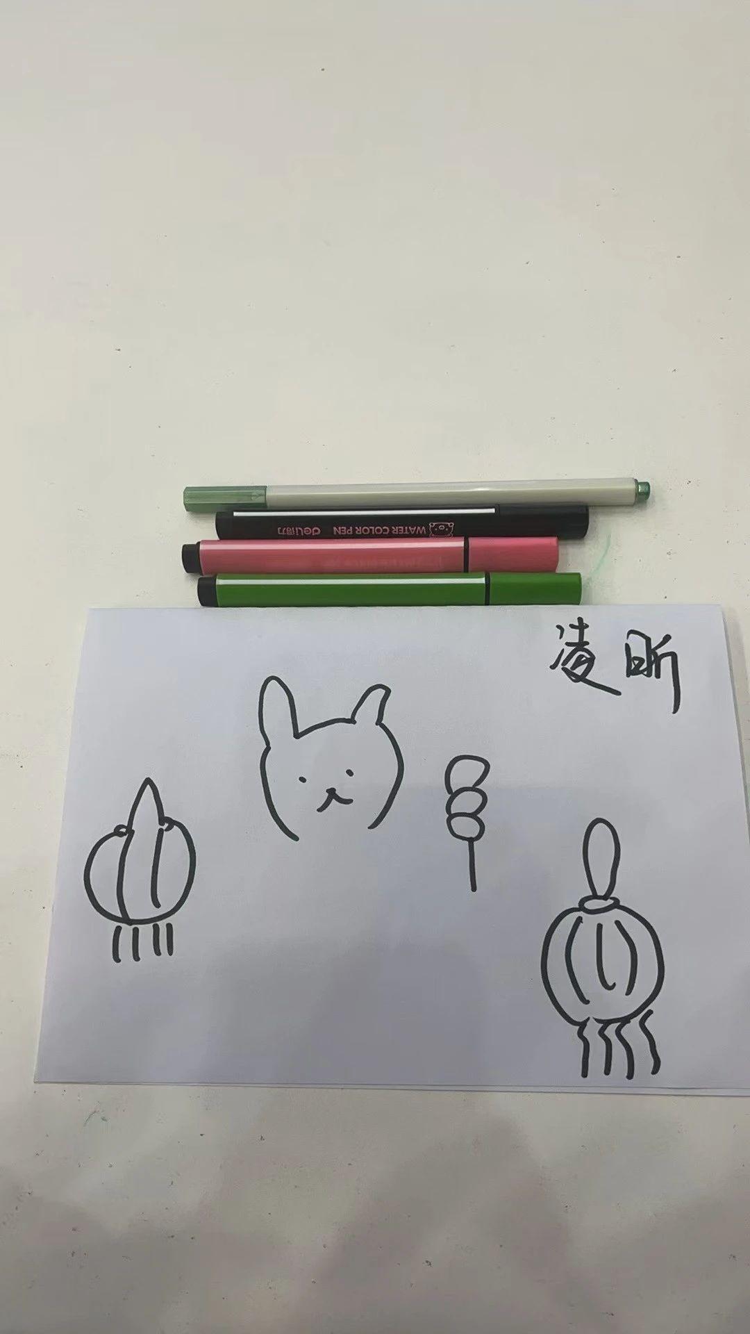 这幅作品以其简洁的线条和生动的形象捕捉了观众的注意力。画面中,主要元素是一个卡通风格的动物头像,两个灯笼形状的图案,以及一只手握着圆形物体。整体风格简单而富有趣味,传达出一种轻松愉悦的情感。这种风格常见于儿童绘画中,传递出纯真无邪的特质。
