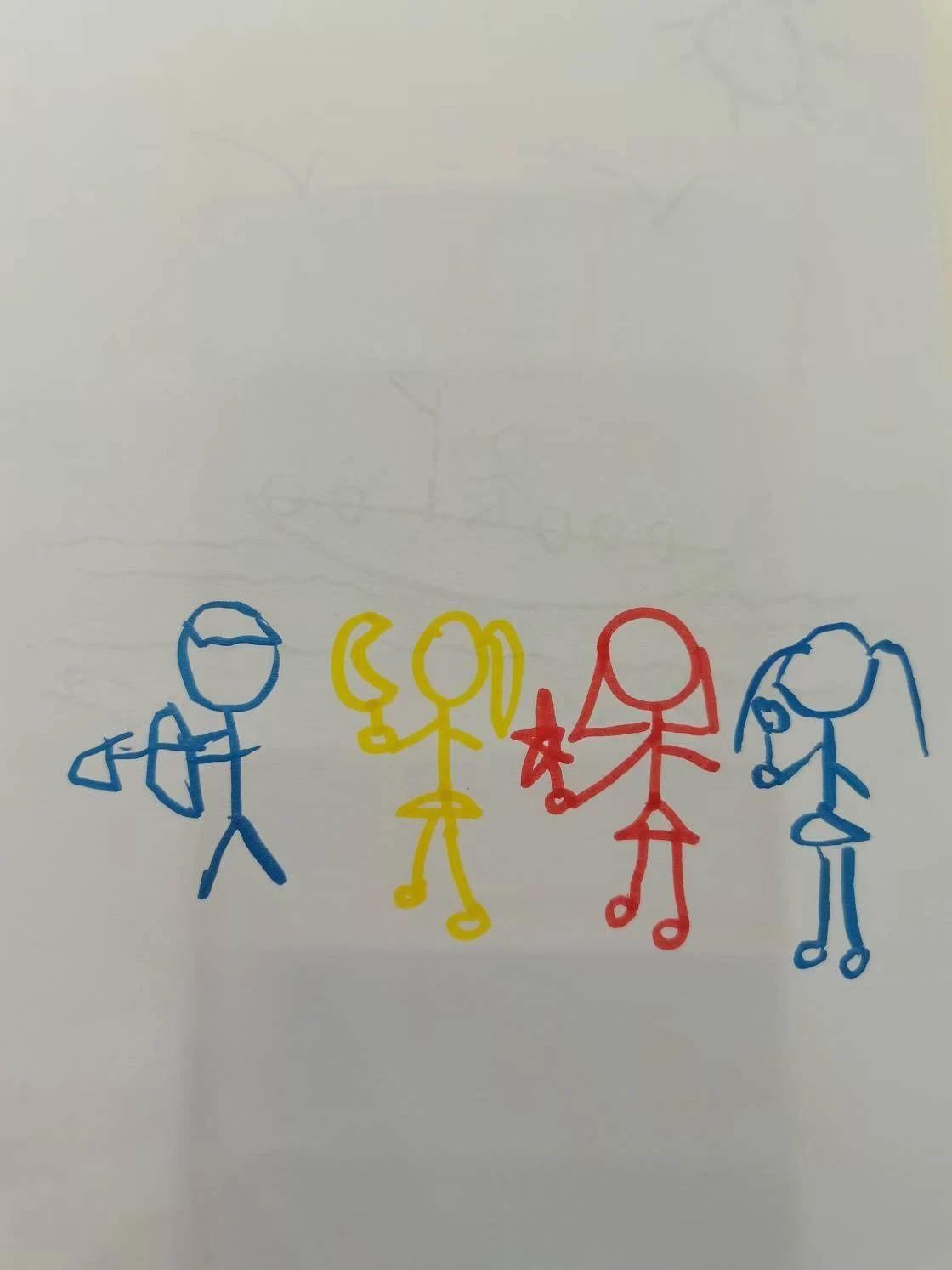 这幅作品以其简单却富有表现力的线条和色彩吸引了我们的注意。四个色彩鲜明的卡通人物各自手持不同的物品,仿佛在展示他们各自独特的性格或角色。蓝色、黄色、红色和蓝色的使用给人一种视觉上的愉悦感,这种颜色的对比和搭配使整个画面显得生动有趣。作为一名儿童艺术专家,我认为这幅作品很好地捕捉了儿童艺术的精髓:简单、直接且充满想象力。为了增强作品的艺术性,可以在背景中加入一些简单的元素,比如树木、云朵或阳光,这样不仅能丰富画面的层次感,还能为观者提供更多的想象空间。此外,可以在色彩上尝试一些渐变效果,使人物形象更加立体和生动。通过这些细微的调整,作品不仅能保持其原有的童趣,还能在艺术表现上更上一层楼,给观者带来更多的视觉和情感上的享受。