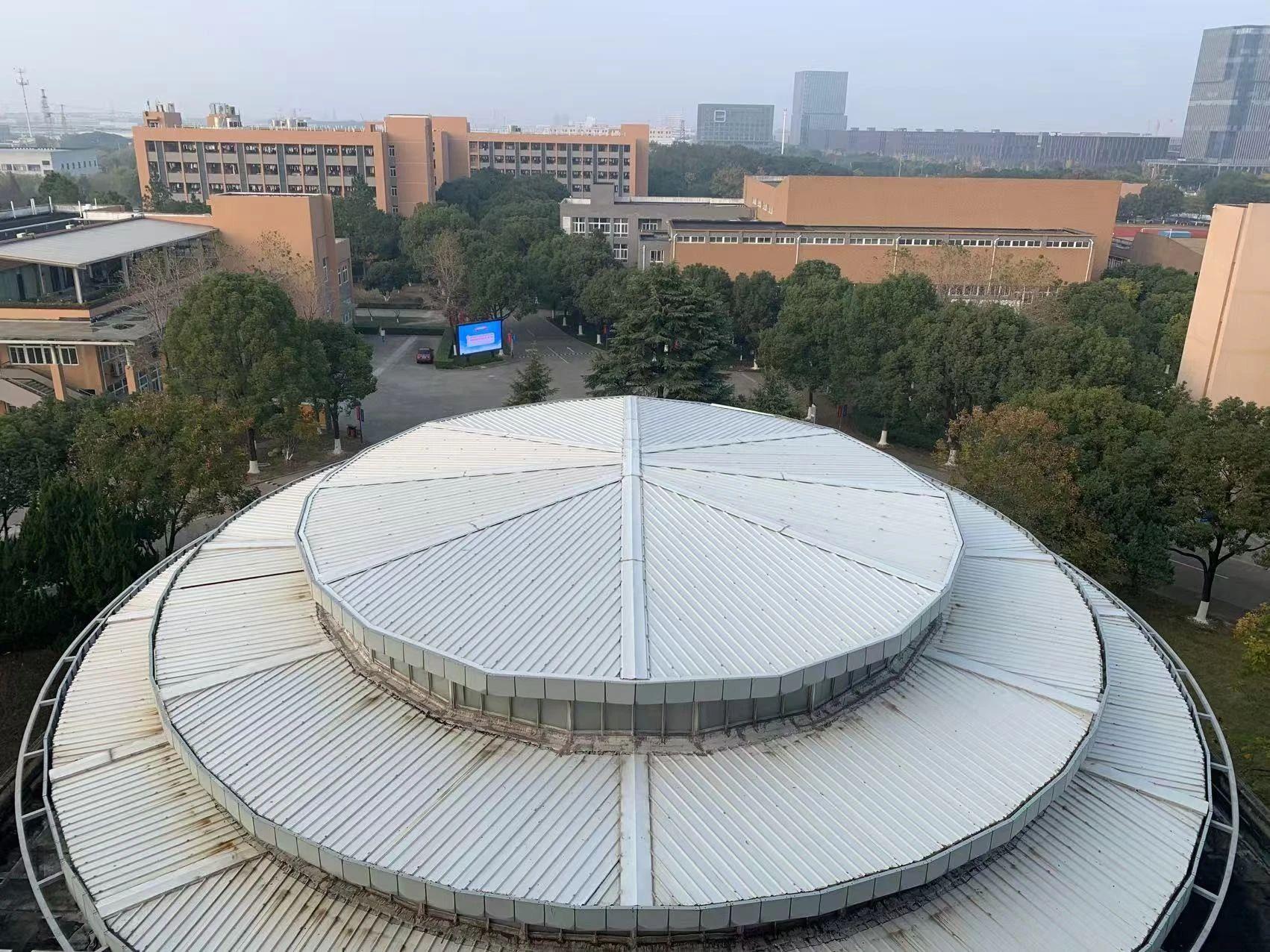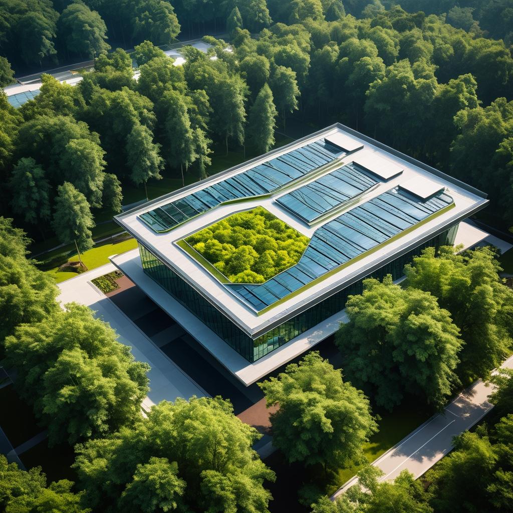 这幅图片展现了一座现代建筑屋顶的独特视角,周围环绕着绿树茂密的校园环境。建筑物的几何形状和对称性在画面中占据了中心位置,背景中的教学楼和远处的高楼提供了丰富的层次感。色调较为自然,暖色系的建筑和绿色的树木相得益彰,营造出一种宁静和谐的氛围。