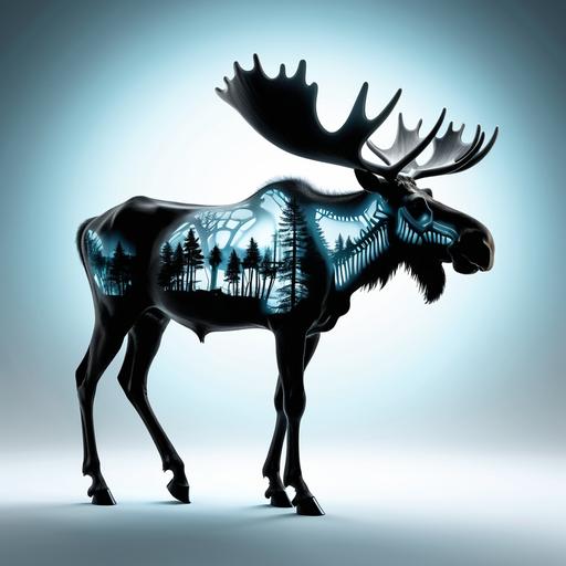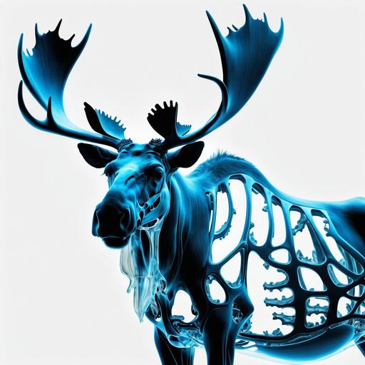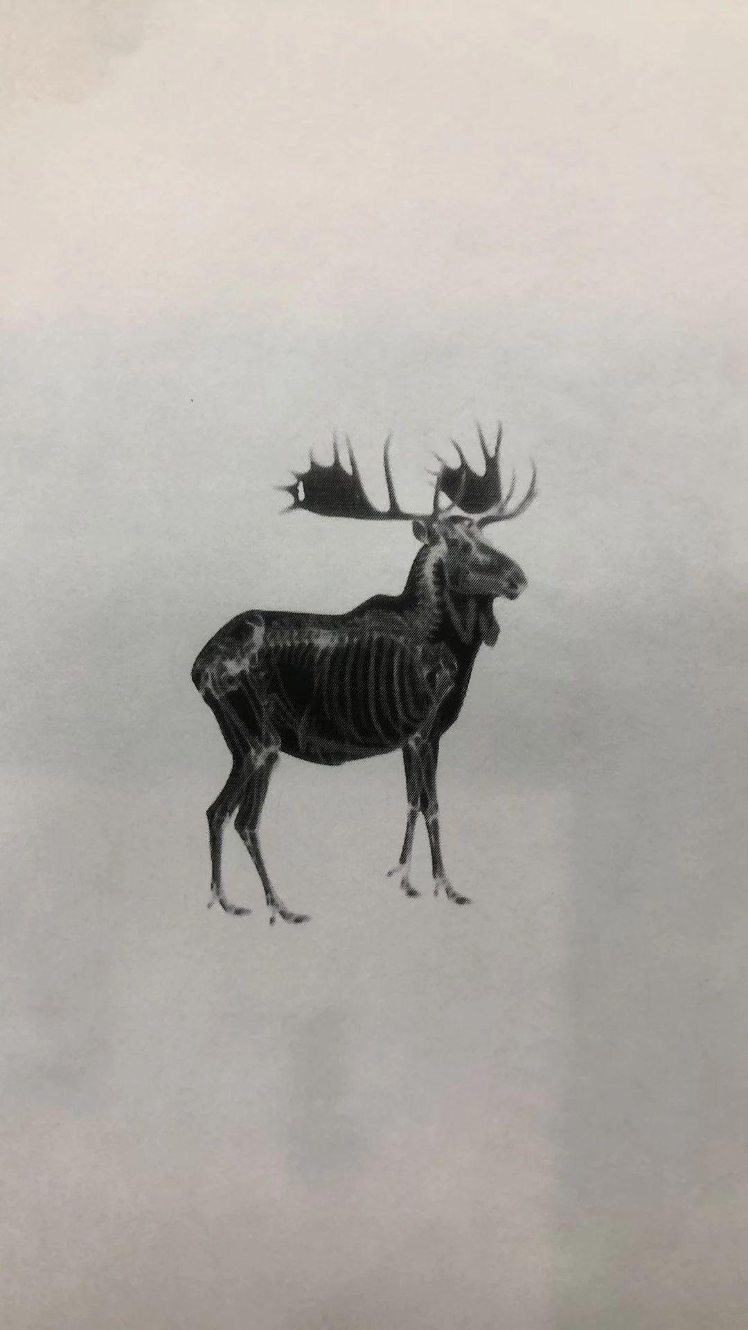 这幅作品展示了一只驼鹿的X光图像,使用黑白色调,背景简约。整体呈现出一种神秘和科学探索的感觉,可能传达对自然界生物结构的关注与思考。