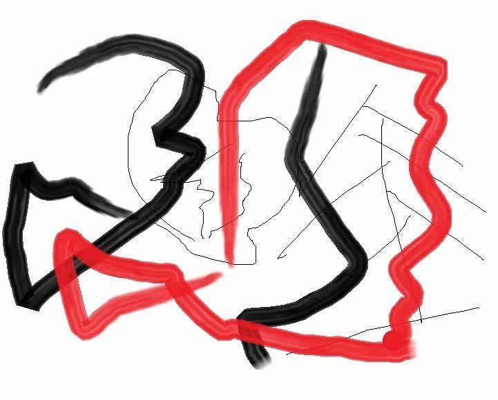 这幅作品使用了简单的黑色和红色线条,呈现出一种抽象的形态。线条的流动和交错暗示了一种动态的对话,可能表达了某种内心的冲突或情感的碰撞。创作者通过这种朴素而又强烈的对比,传递出一种强烈的情感张力。