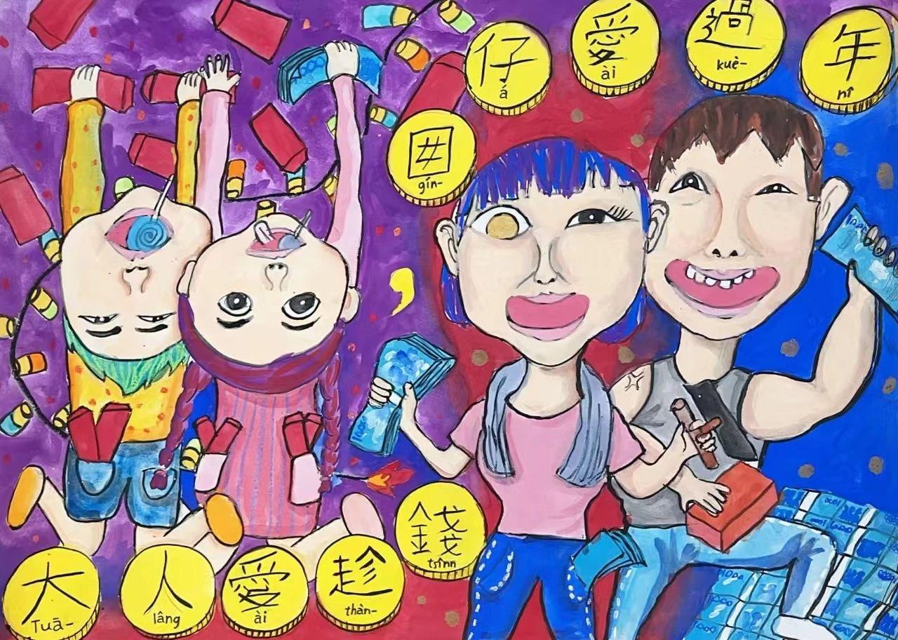 这幅作品充满了鲜艳的色彩和夸张的人物形象,传达了一种欢乐和讽刺的情感。画面中的人物表情夸张,背景色调丰富,主要以紫色和蓝色为主,充满动感。画面上的中文和拼音文字增加了文化特征,可能在探讨关于金钱的主题。