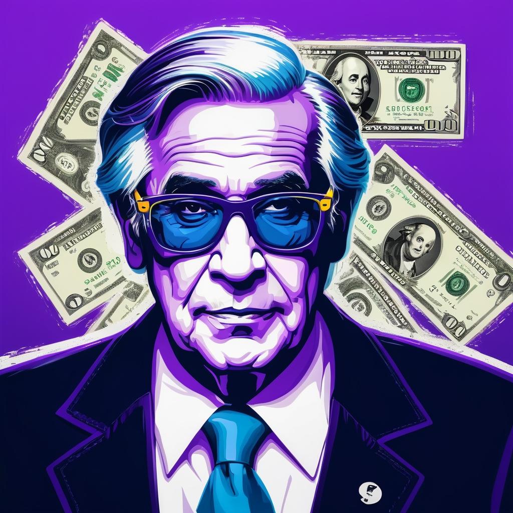 这幅作品通过夸张的人物和鲜艳的色彩表现了一种儿童般的天真和对金钱的讽刺。创作者可能试图通过这种方式表达对消费文化的思考或批判。可以通过增加细节来加深这种讽刺的效果,例如在背景中增加更多的符号来代表现代社会的消费狂潮,或通过改变人物的表情来增强情感的传达。此外,可以尝试在色彩上增加渐变效果,增强作品的层次感,使观者在视觉上感受到一种由浅入深的变化。