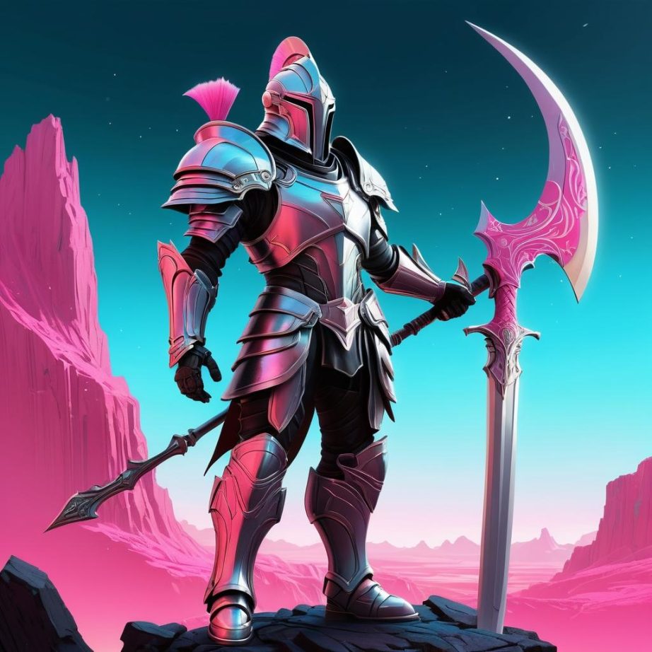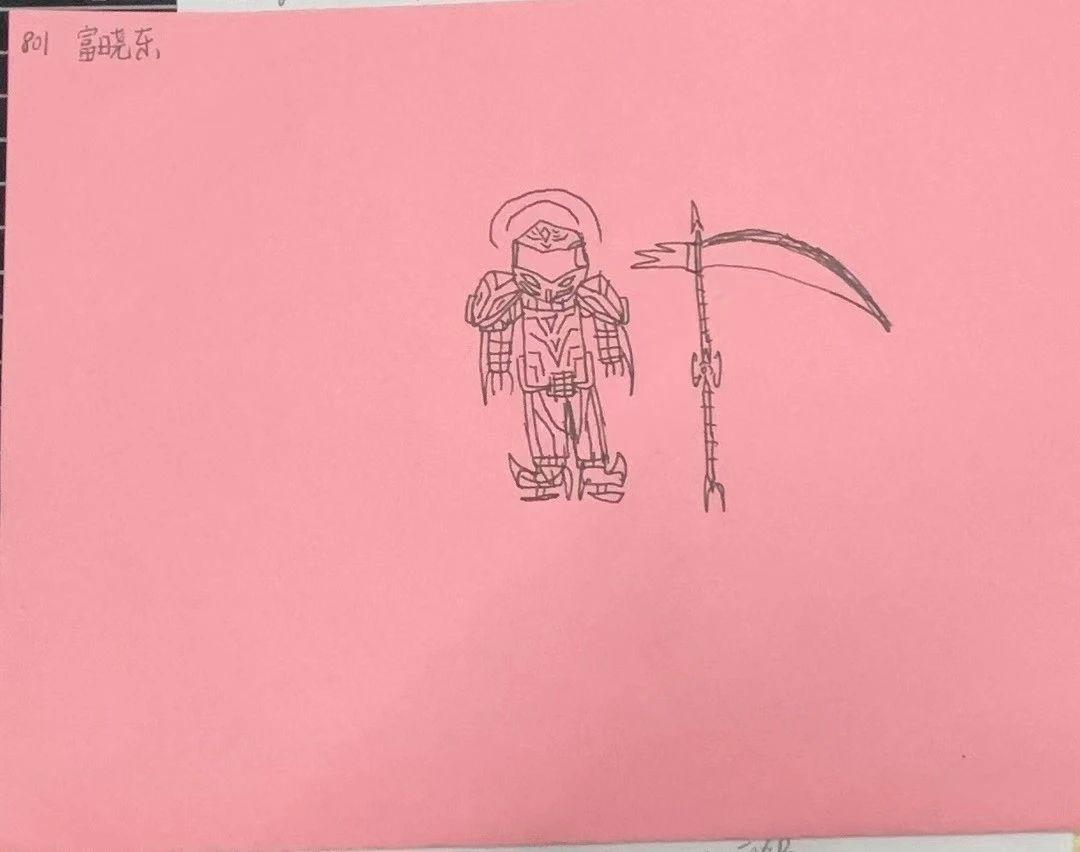 这幅作品描绘了一个身穿盔甲的角色,手持镰刀,背景是简单的粉色纸张。人物线条简洁,具有卡通风格,盔甲和武器的设计透露出一种未来感和幻想元素。整体构图简单而富有趣味,可能传达了一种勇敢或神秘的主题。