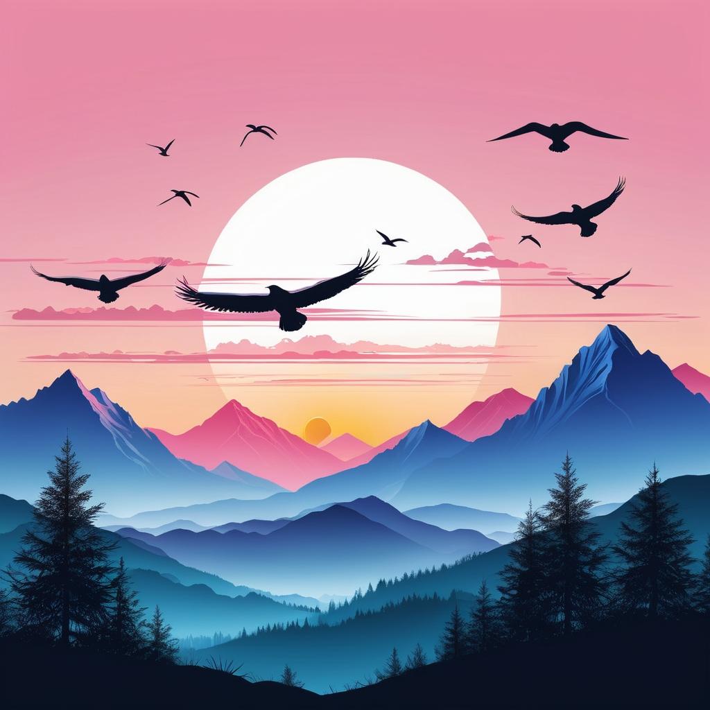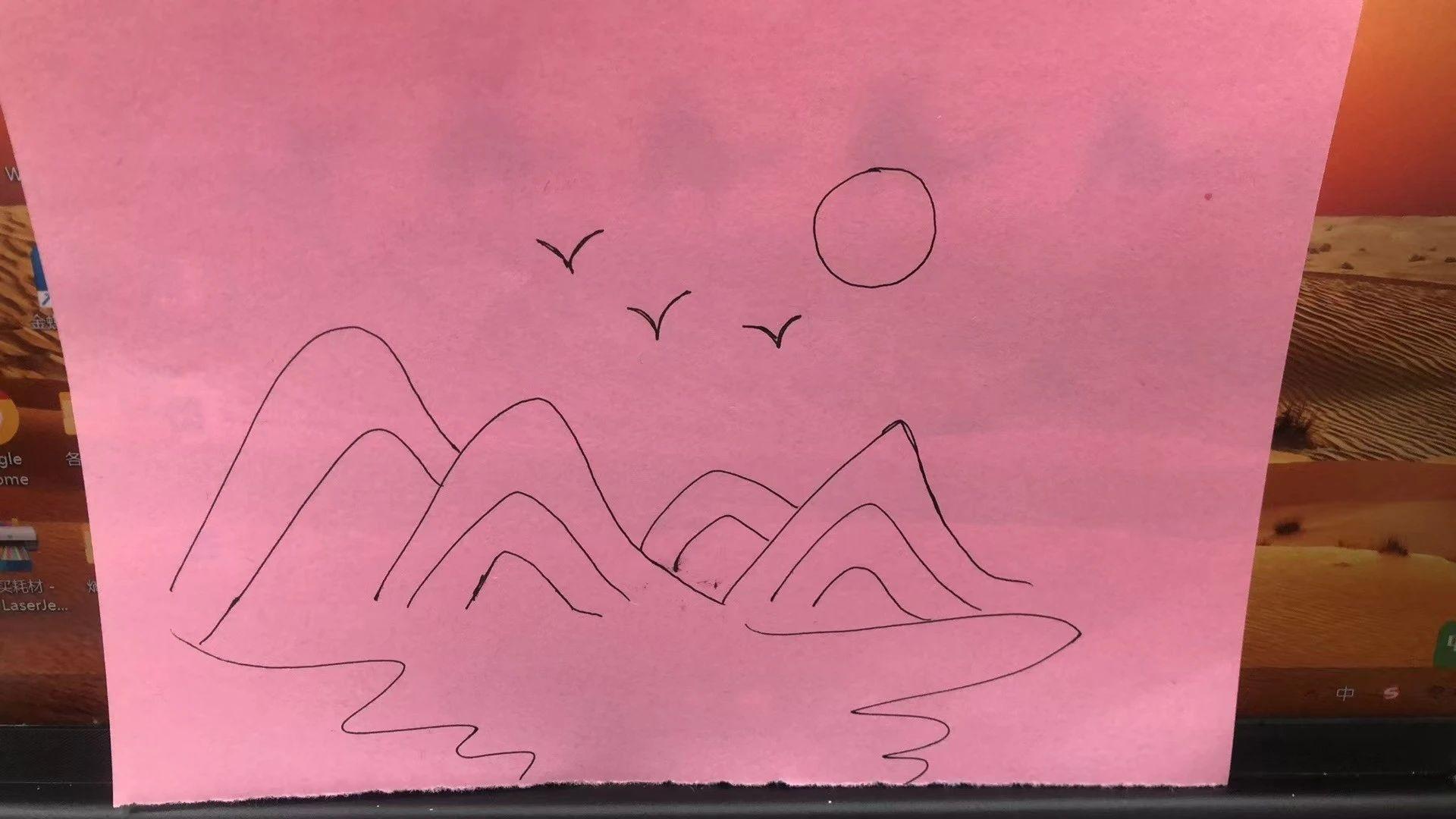 这幅作品是一幅简单的线条画,描绘了山脉、太阳和飞鸟。整个画面采用了粉色的背景,给人一种温暖和宁静的感觉。图中的元素非常简洁,能够传达出一种自然的和谐美。
