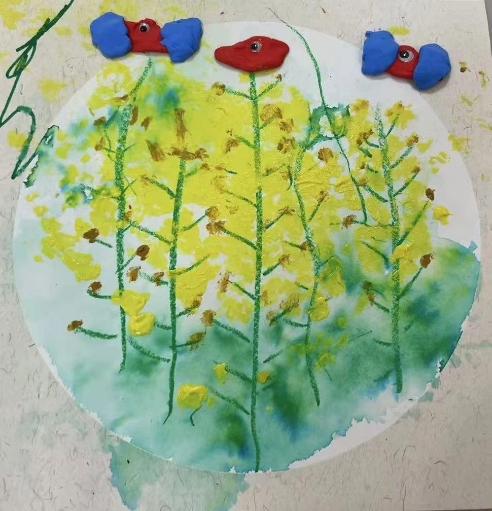 这幅作品以其鲜艳的颜色和有趣的构图吸引了我们的注意。孩子们往往能通过简单的图画表达出他们对自然的直观感受。这幅作品以黄色和绿色为主色调,象征着春天的活力和生命的繁盛。红色和蓝色的黏土装饰增添了些许奇幻与童趣,仿佛是孩子眼中大自然的精灵。通过这种方式,作品不仅展示了自然的美丽,也传达了孩子与自然之间的纯真互动。