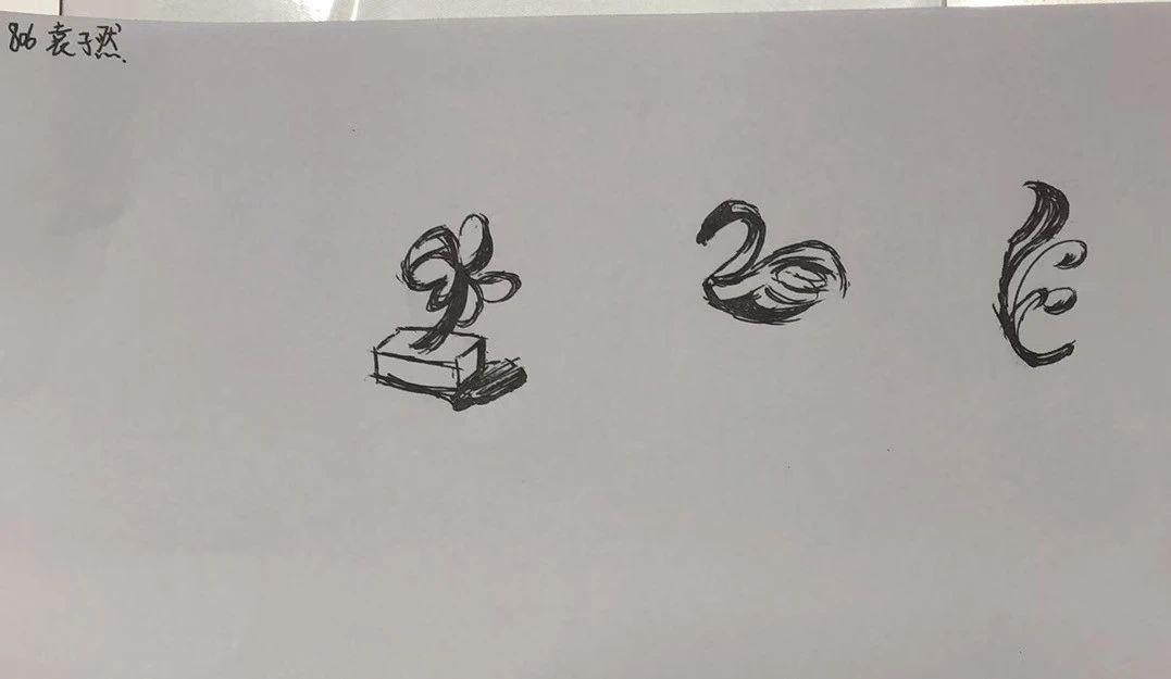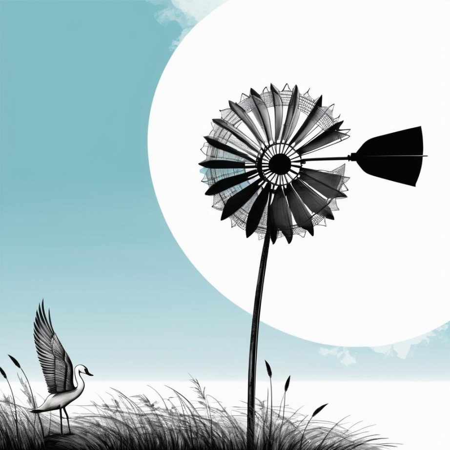 这幅作品使用简单的黑色线条描绘了三个主要元素:一个花朵状的风车,一个天鹅形状的图案,以及一个羽毛状的图形。作品整体呈现出一种简约而生动的风格,可能意在传达自然的优雅与生命的活力。