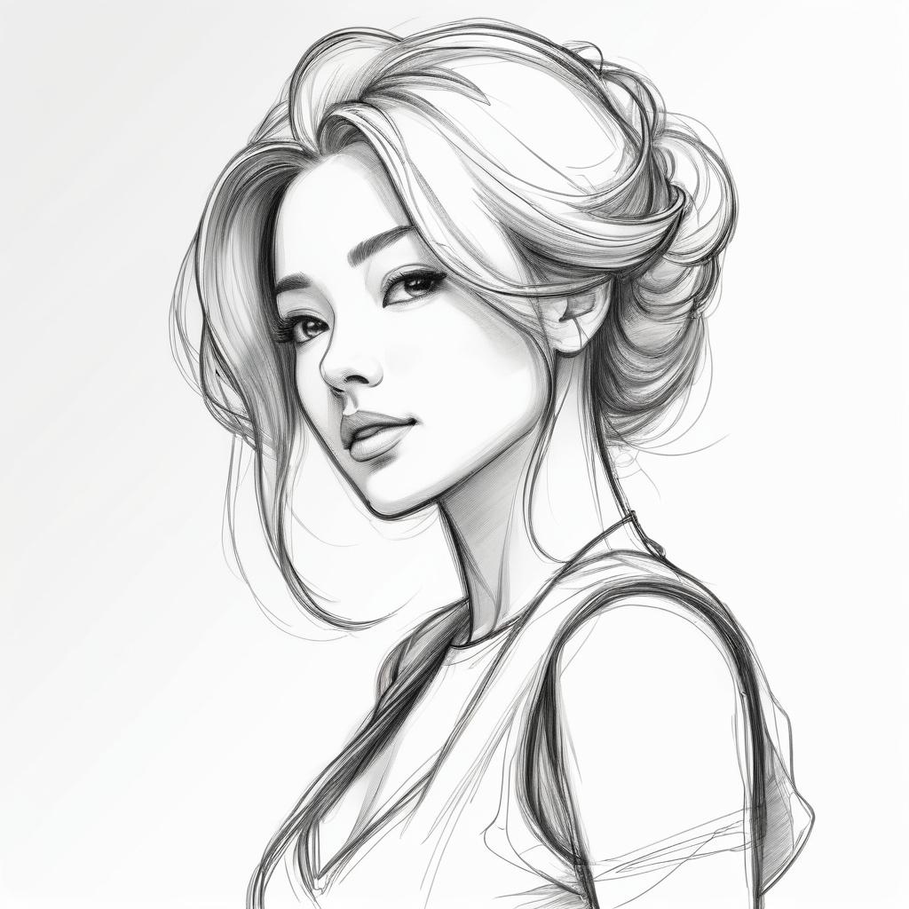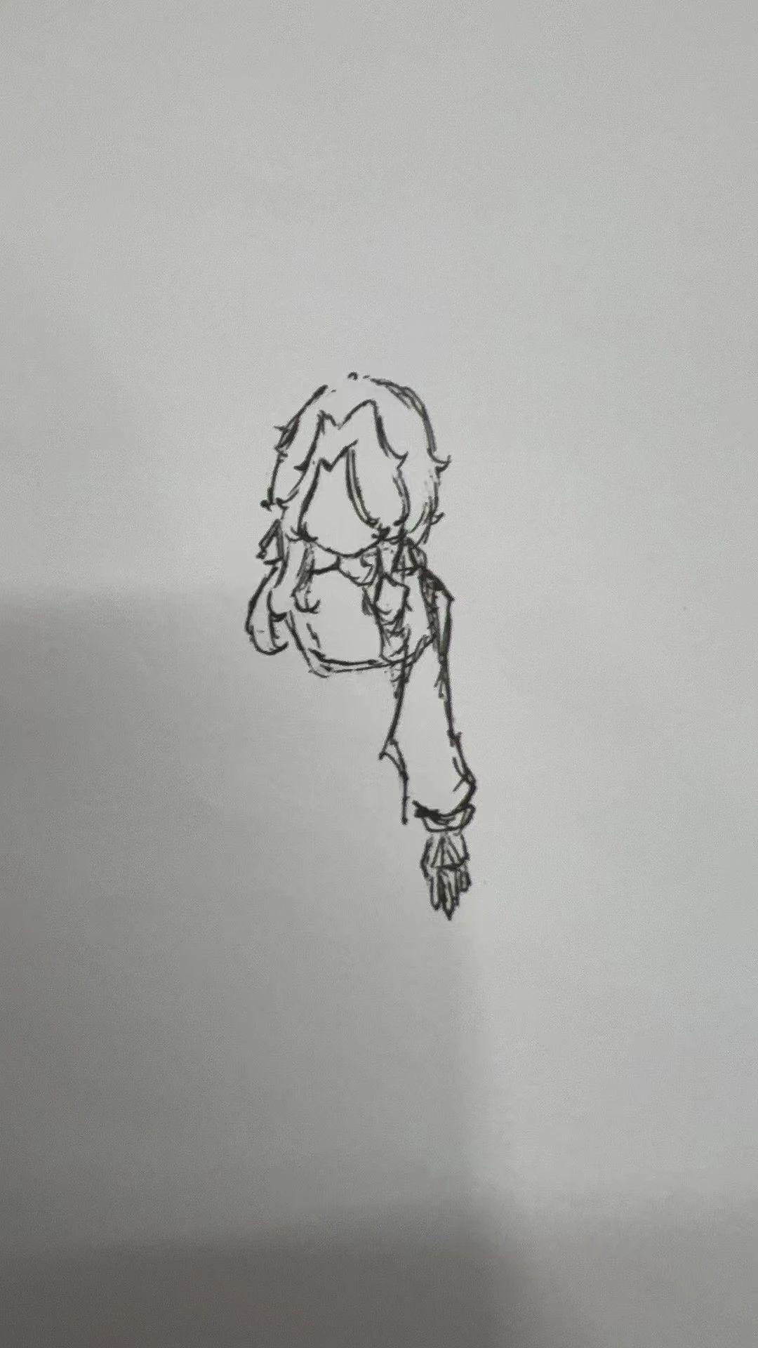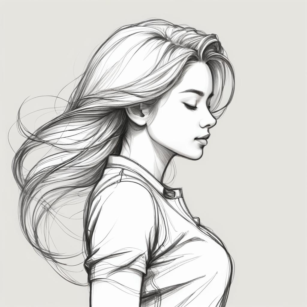 这幅草图展示了一个人物的上半身,运用了简单的线条表现人物的轮廓和姿态。画面中主要元素是人物的头发和衣服,线条流畅,给人一种轻松随意的感觉。整体构图简洁,人物的姿态略微前倾,似乎在传达某种动态或情感。
