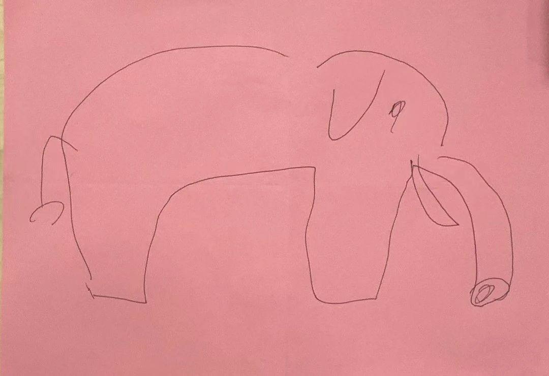 这幅作品是一幅简单的线条画,描绘了一只大象的轮廓。背景是单一的粉红色,线条流畅而随意,给人一种天真和稚拙的感觉。这种简约的风格可能反映了创作者对大象这种庞然大物的童趣理解。整体构图简单而直接,突出大象的长鼻子和耳朵。