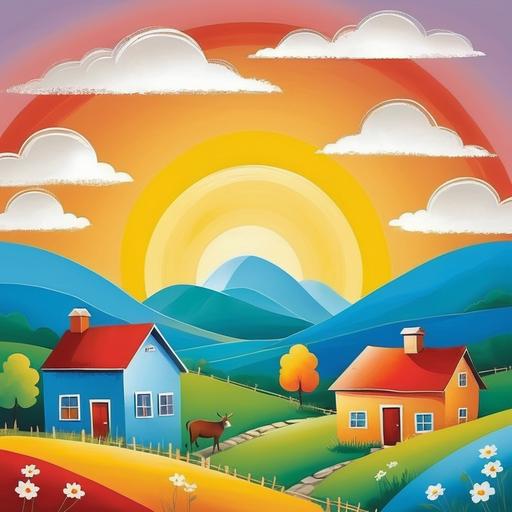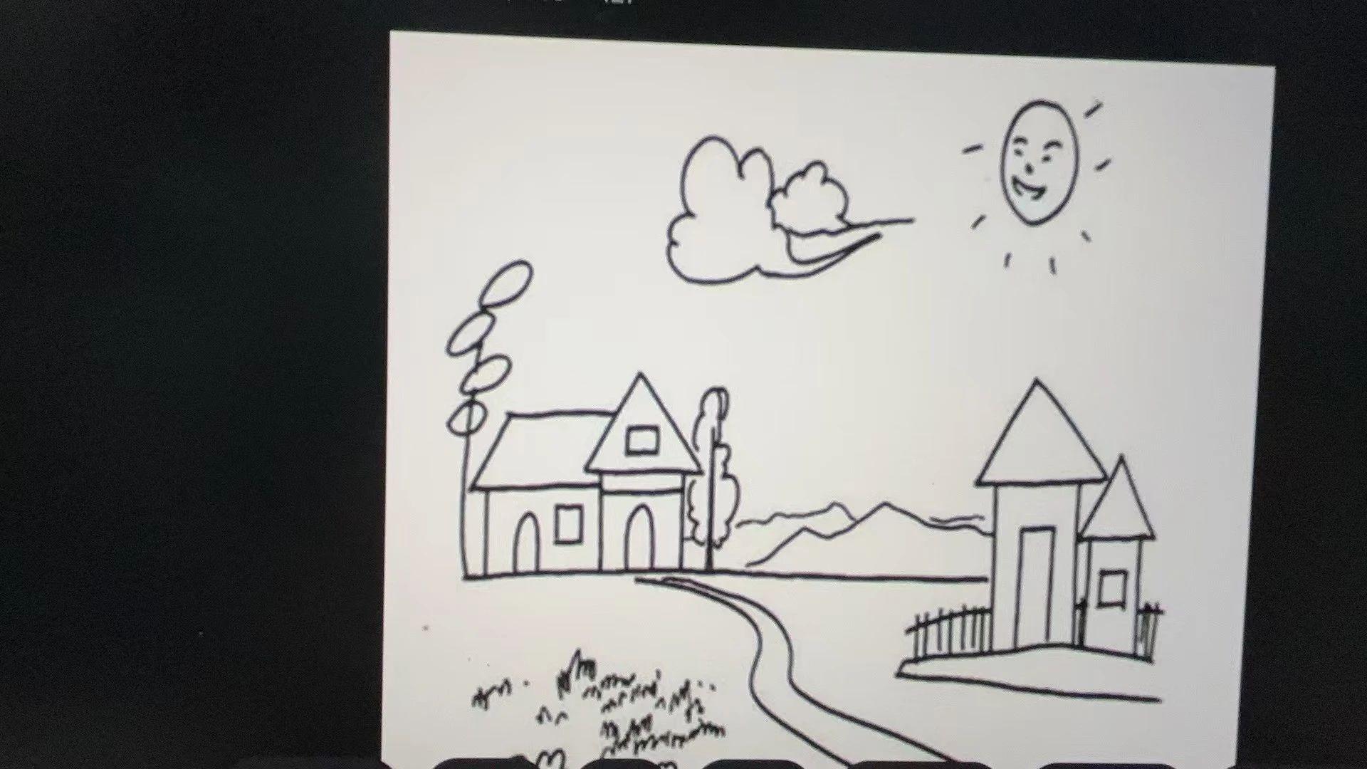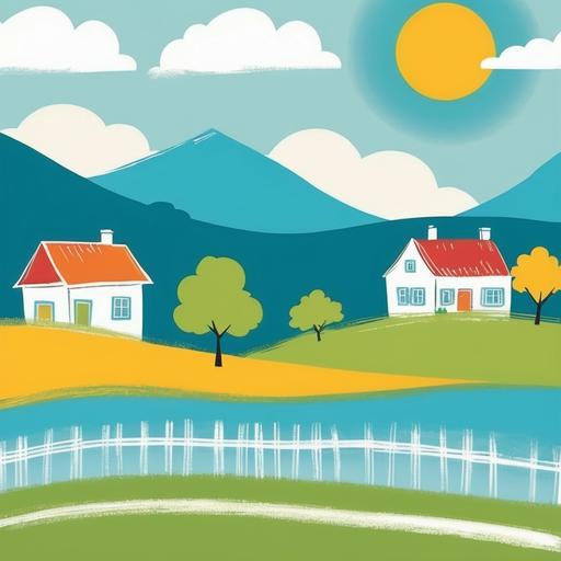 这幅图画展现了一个简单的田园风光,包含了房屋、树木、云朵和太阳。线条简单直接,构图具有儿童画的质朴和天真。整体画面给人一种平和、快乐的氛围。