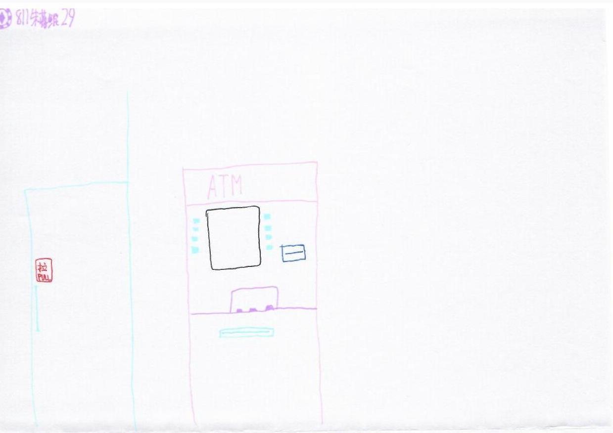 图片可能是倒置的,需旋转180度。作品以极简线条勾勒出一个ATM机和一扇门,色彩上使用了浅色调,如蓝色和粉色,传达出一种简单而轻松的氛围。创作者可能在探讨现代生活中技术与人之间的关系。