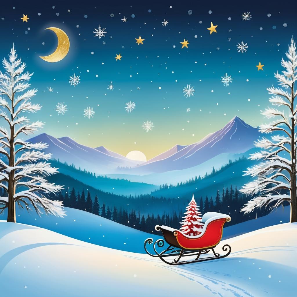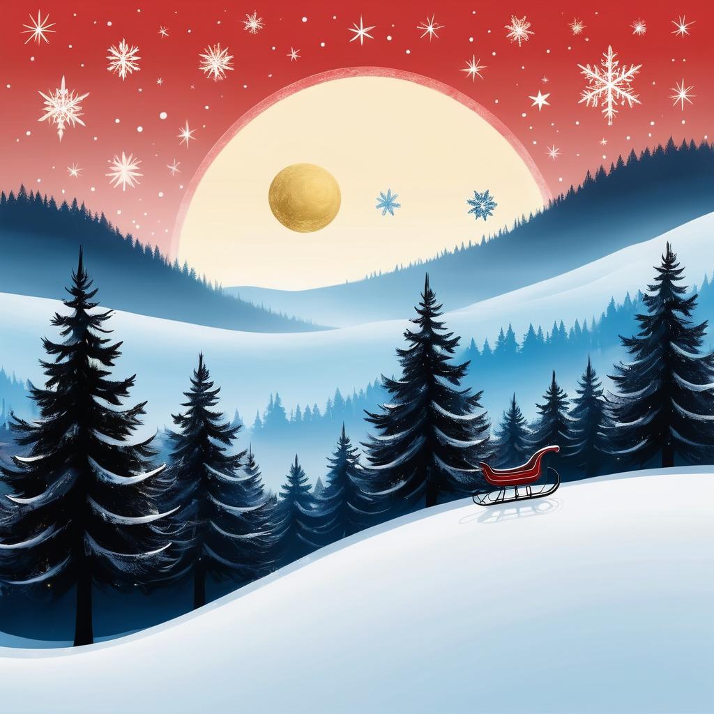 这幅画作展示了一片冬季的松树林,几棵松树上顶着星星,背景中有一个红色圆形的月亮或太阳,旁边有一个小小的雪橇形象在空中。线条简洁,整体构图给人以安静祥和的感觉,可能传达的是一种纯真的冬日幻想。