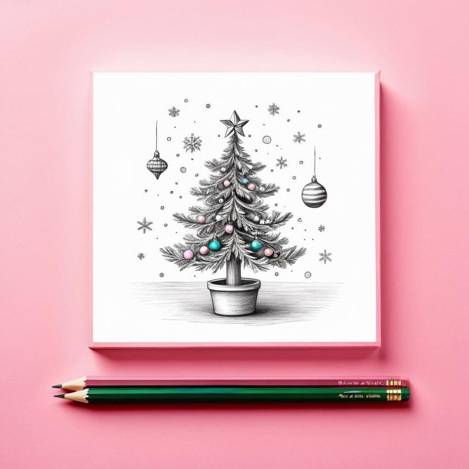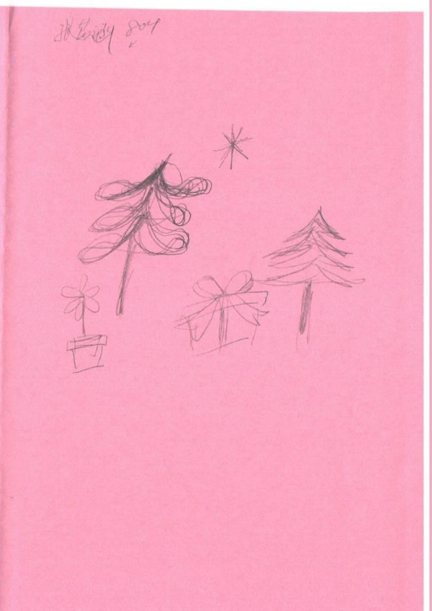 这幅作品使用了简单的铅笔线条在粉色纸上绘制。主要元素包括一个圣诞树、一份礼物和一朵小花。整体构图较为简约,线条流畅,传达了一种轻松和愉悦的氛围,可能意在表现节日的愉快和温馨。