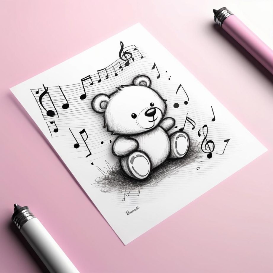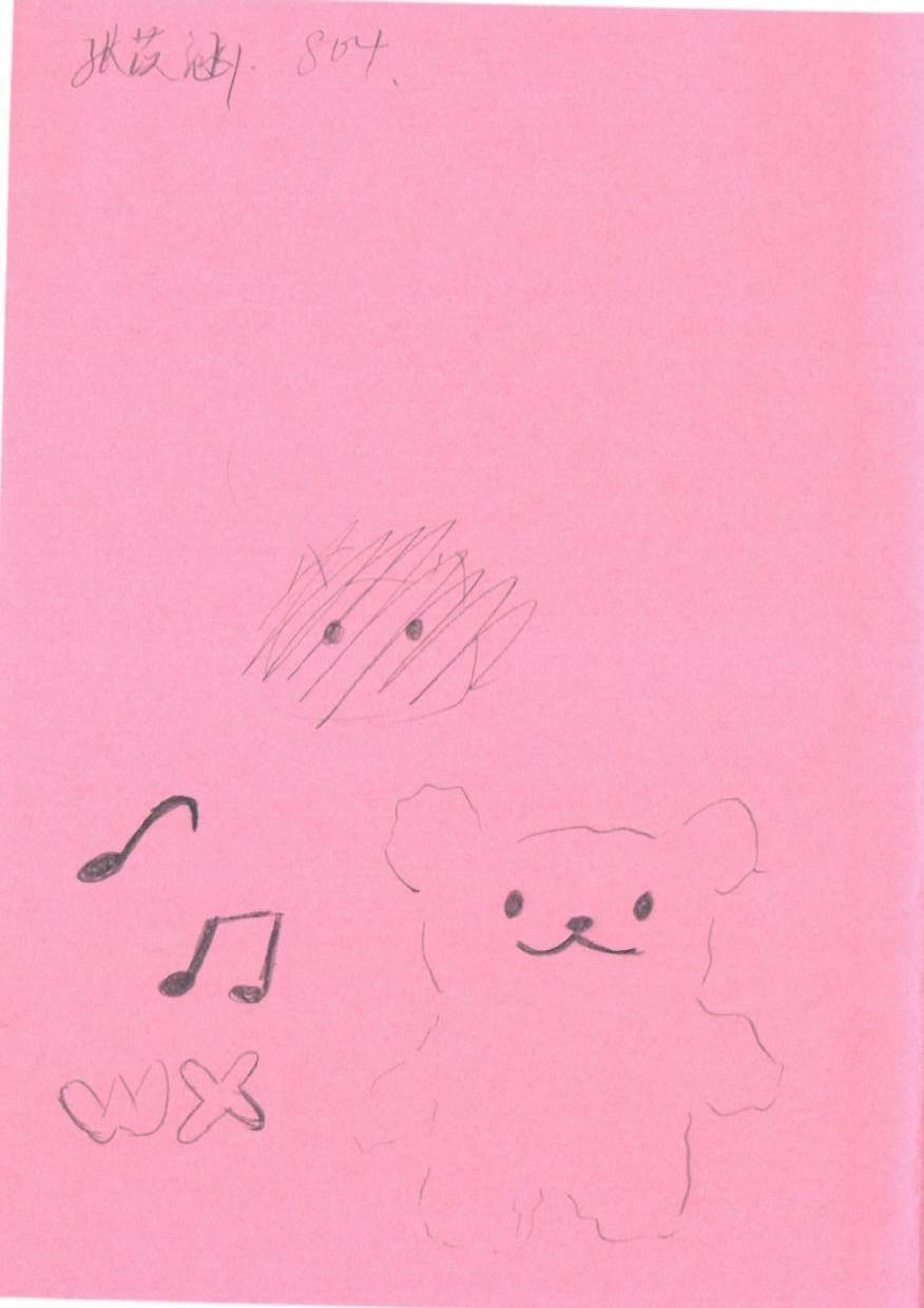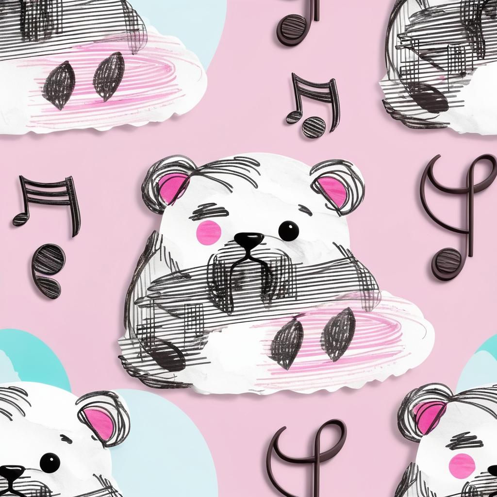 这幅作品以粉色纸张为背景,呈现出一种温馨而柔和的氛围。主要元素包括一个简单勾勒的熊形图案、两个音乐符号和一个草图状的形象。整体构图自由而随意,反映了一种童趣和创意的表达。创作者可能试图通过这些元素传达一种轻松愉悦的情感。