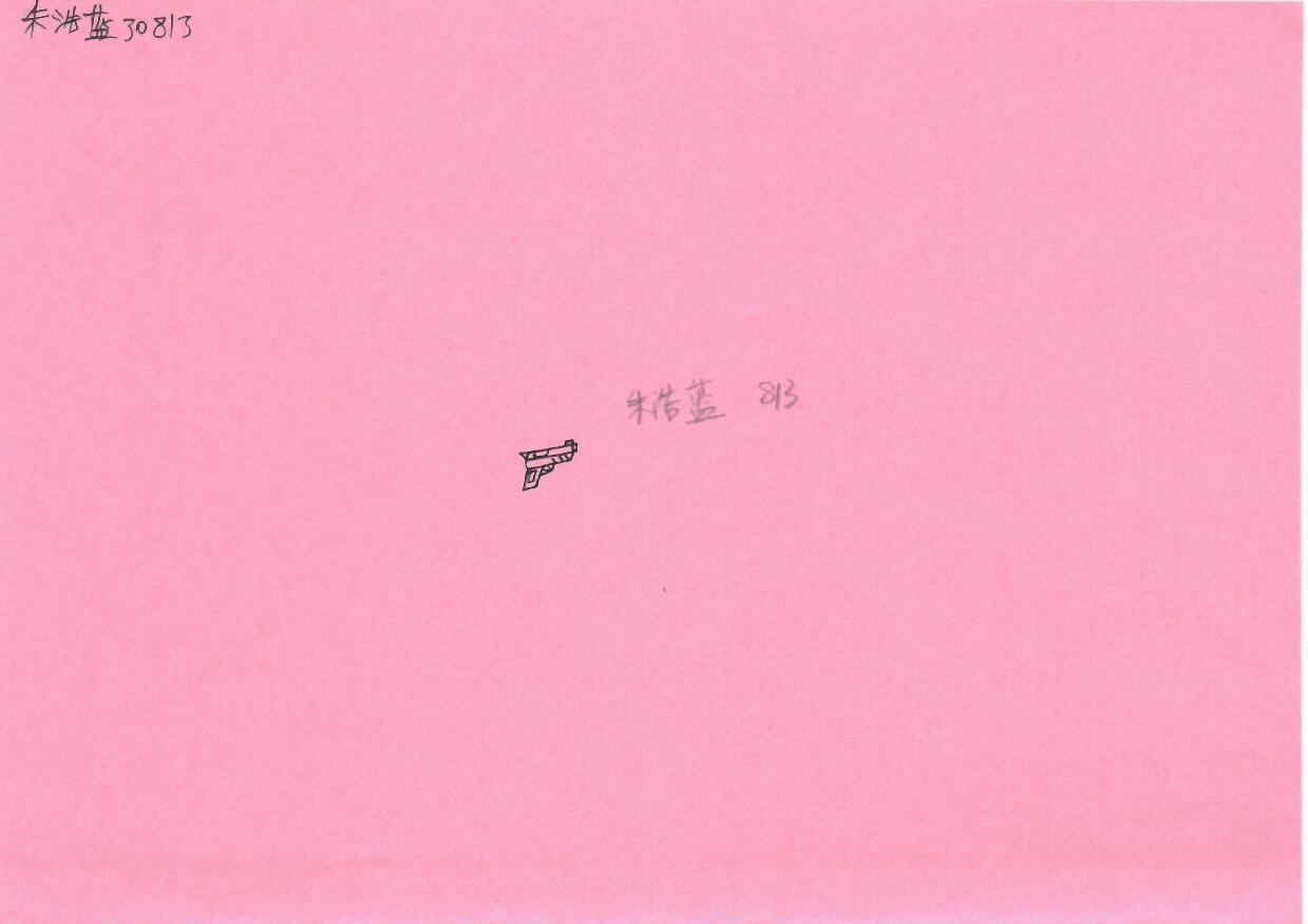 这幅作品以粉色为背景,中心偏右的位置有一个小型手枪的线条画,左上角有手写的文字。整体构图简单,背景的粉色为作品带来柔和的感觉,但与手枪的元素形成对比,可能在表达冲突或讽刺的主题。