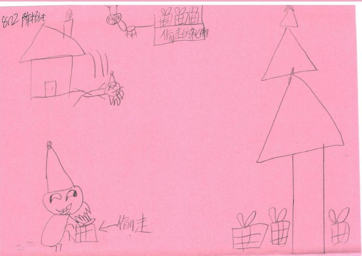 这幅作品是一幅儿童画,采用简单的线条勾勒出圣诞节的场景。画面中有一个圣诞树、房子、小偷和礼物。整体采用粉红色的背景,给人一种温暖和快乐的感觉。小偷的加入为画面增添了趣味性和戏剧性,可能象征着孩子对节日中善恶对比的思考。