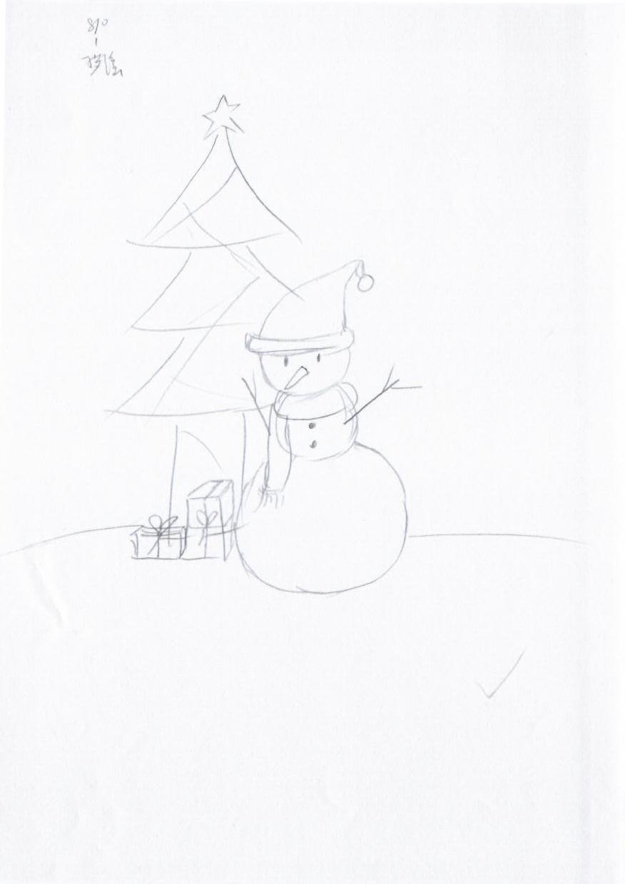 这幅画是一幅简单的铅笔素描,描绘了一个雪人戴着圣诞帽,旁边是一棵圣诞树和几个礼物盒。整体构图简洁,线条简单而清晰,传达出一种节日的氛围。创作者可能希望用这幅画表达冬季的节日气息和童趣。